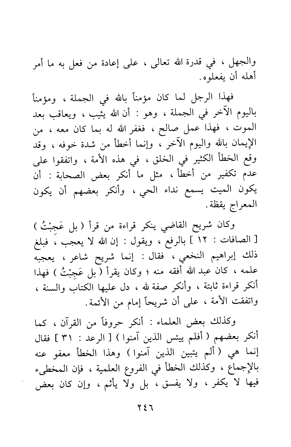 وكذلك بعض العلماء أنكر حروفا من القرآن، كما أنكر بعضهم {أَفَلَمْ يَيْأَسِ الَّذِينَ آمَنُوا} 1 فقال إنما هي: "ألم يتبين الذين آمنوا"، وهذا الخطأ معفو عنه بالإجماع؛ وكذلك الخطأ في الفروع العلمية، فإن المخطئ فيها لا يكفر، ولا يفسق، بل ولا يأثم، وإن كان بعض