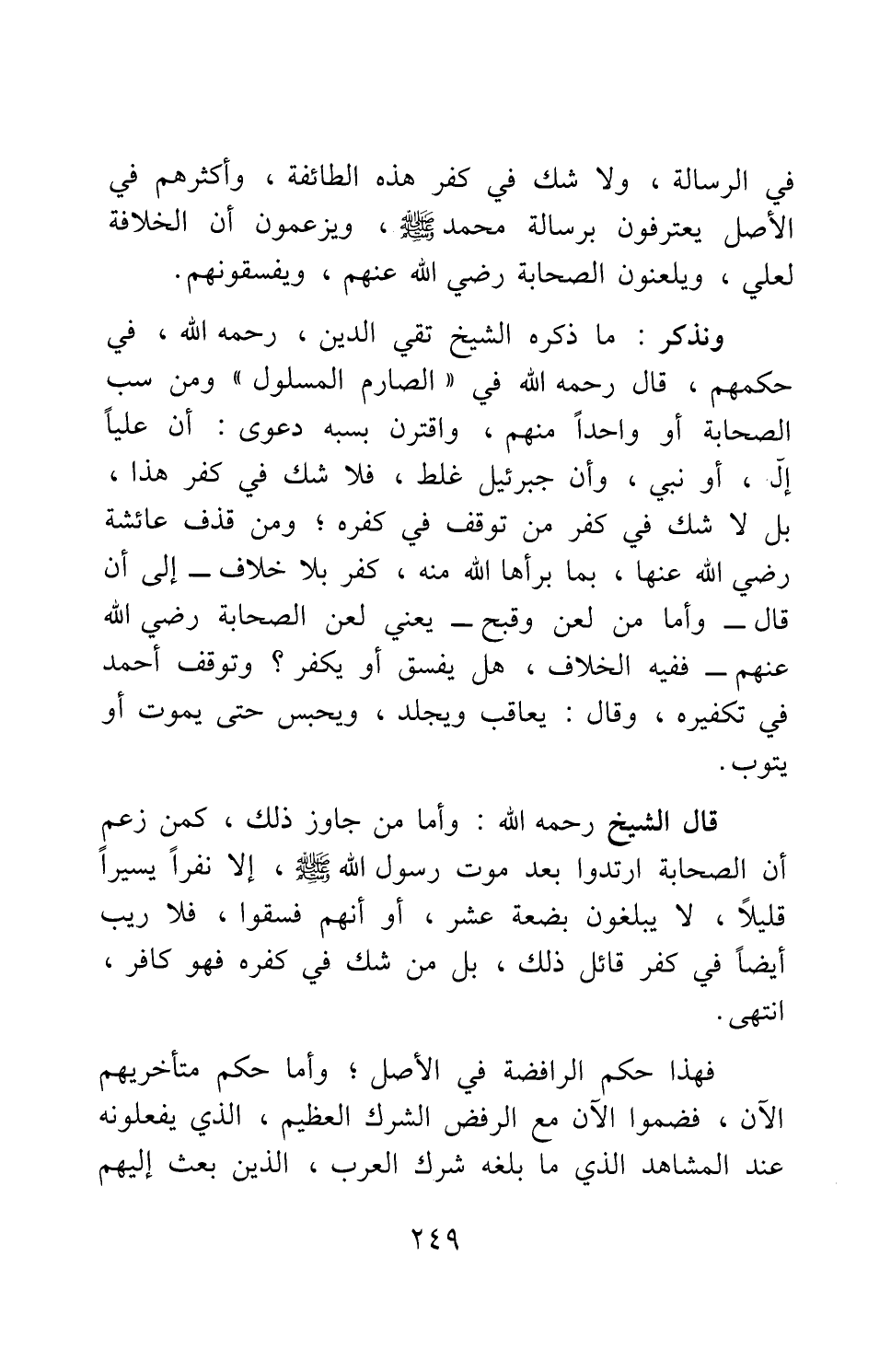 ونذكر ما ذكره الشيخ تقي الدين، رحمه الله، في حكمهم، قال رحمه الله في "الصارم المسلول": ومن سب الصحابة أو واحدا منهم، واقترن بسبه دعوى أن عليا إله، أو نبي، وأن جبرائيل غلط، فلا شك في كفر هذا؛ بل لا شك في كفر من توقف في كفره. ومن قذف عائشة رضي الله عنها، بما برأها الله منه، كفر بلا خلاف، إلى أن قال: وأما من لعن وقبح- يعني لعن الصحابة رضي الله عنهم-، ففيه الخلاف، هل يفسق أو يكفر؟ وتوقف أحمد في تكفيره، وقال: يعاقب ويجلد، ويحبس حتى يموت أو يتوب.