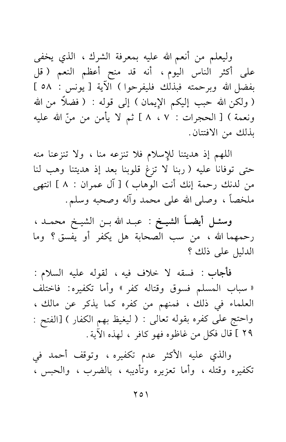 وليعلم من أنعم الله عليه بمعرفة الشرك، الذي يخفى على أكثر الناس اليوم، أنه قد منح أعظم النعم، {قُلْ بِفَضْلِ اللَّهِ وَبِرَحْمَتِهِ فَبِذَلِكَ فَلْيَفْرَحُوا} 1، {وَلَكِنَّ اللَّهَ حَبَّبَ إِلَيْكُمُ الْأِيمَانَ} 2 إلى قوله: {فَضْلاً مِنَ اللَّهِ وَنِعْمَةً} 3، ثم لا يأمن من من الله عليه بذلك من الافتتان.