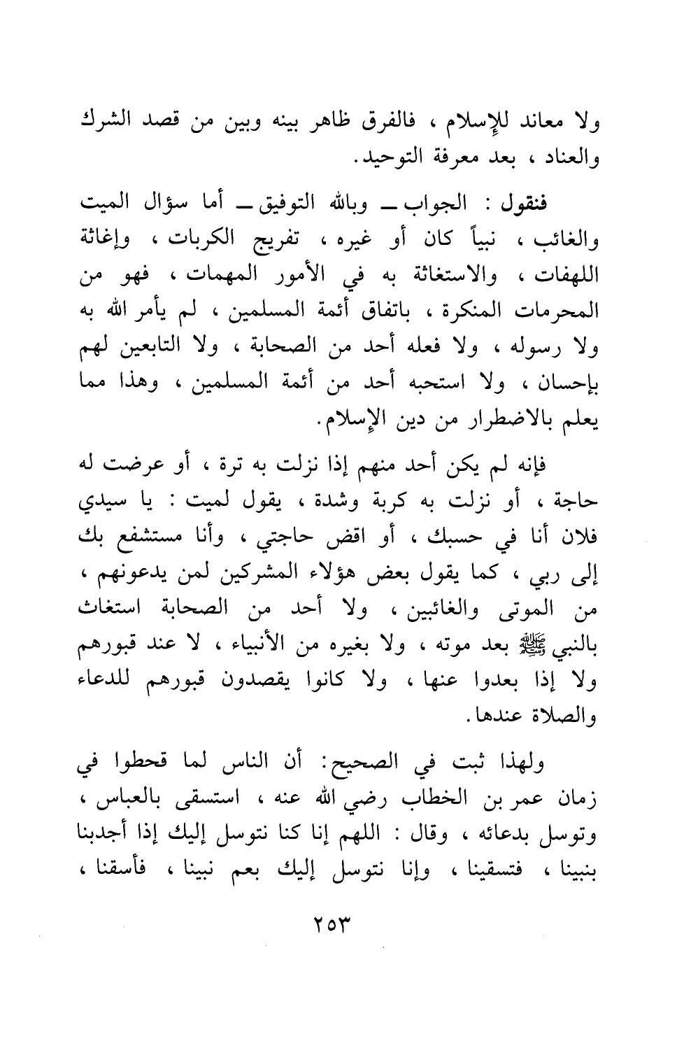 فإنه لم يكن أحد منهم إذا نزلت به ترة، أو عرضت له حاجة، أو نزلت به كربة وشدة، يقول لميت: يا سيدي فلان أنا في حسبك، أو اقض حاجتي، وأنا مستشفع بك إلى ربي، كما يقول بعض هؤلاء المشركين لمن يدعونهم، من الموتى والغائبين؛ ولا أحد من الصحابة استغاث بالنبي صلى الله عليه وسلم بعد موته، ولا بغيره من الأنبياء، لا عند قبورهم ولا إذا بعدوا عنها، ولا كانوا يقصدون قبورهم للدعاء والصلاة عندها.