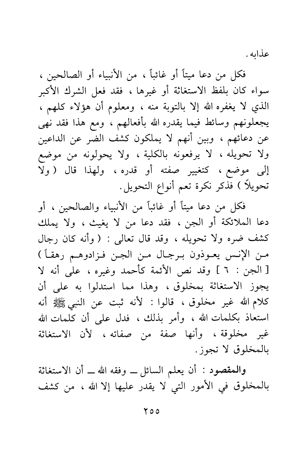 فكل من دعا ميتا أو غائبا من الأنبياء والصالحين، أو دعا الملائكة أو الجن، فقد دعا من لا يغيث، ولا يملك كشف ضره ولا تحويله، وقد قال تعالى: {وَأَنَّهُ كَانَ رِجَالٌ مِنَ الْأِنْسِ يَعُوذُونَ بِرِجَالٍ مِنَ الْجِنِّ فَزَادُوهُمْ رَهَقاً} 1. وقد نص الأئمة كأحمد وغيره، على أنه لا يجوز الاستغاثة بمخلوق، وهذا مما استدلوا به على أن كلام الله غير مخلوق، قالوا: لأنه ثبت عن النبي صلى الله عليه وسلم أنه استعاذ بكلمات الله، وأمر بذلك، فدل على أن كلمات الله غير مخلوقة، وأنها صفة من صفاته، لأن الاستغاثة بالمخلوق لا تجوز.