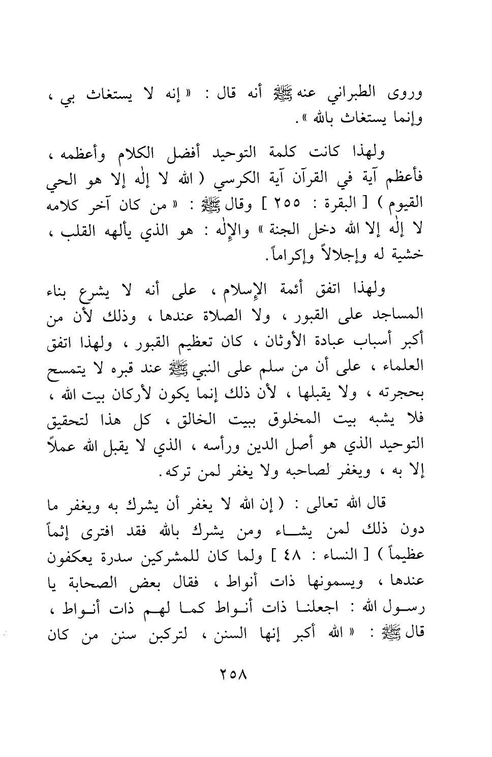 قال الله تعالى: {إِنَّ اللَّهَ لا يَغْفِرُ أَنْ يُشْرَكَ بِهِ وَيَغْفِرُ مَا دُونَ ذَلِكَ لِمَنْ يَشَاءُ وَمَنْ يُشْرِكْ بِاللَّهِ فَقَدِ افْتَرَى إِثْماً عَظِيماً} 3، ولما "كان للمشركين سدرة يعكفون عندها، ويسمونها ذات أنواط، فقال بعض الصحابة: يا رسول الله، اجعل لنا ذات أنواط كما لهم ذات أنواط، قال صلى الله عليه وسلم: الله أكبر! إنها السنن، لتركبن سنن من كان
