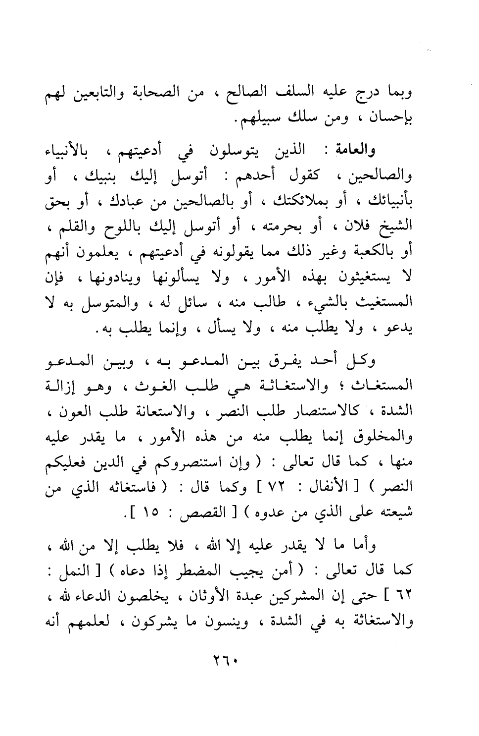 وأما ما لا يقدر عليه إلا الله، فلا يطلب إلا من الله، كما قال تعالى: {أَمَّنْ يُجِيبُ الْمُضْطَرَّ إِذَا دَعَاهُ} 3، حتى إن المشركين عبدة الأوثان، يخلصون الدعاء لله، والاستغاثة به في الشدة، وينسون ما يشركون، لعلمهم أنه