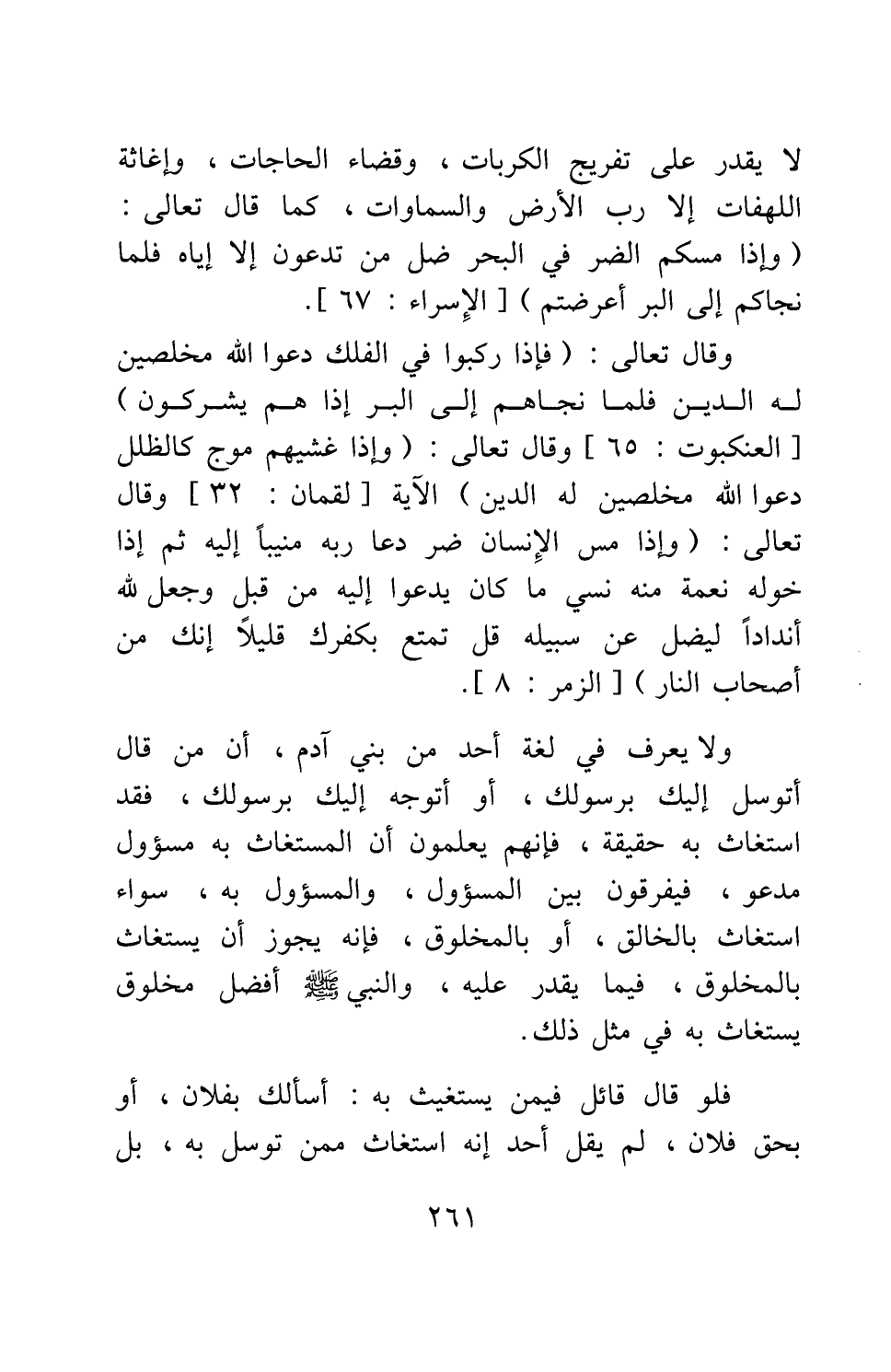 ولا يعرف في لغة أحد من بني آدم، أن من قال: أتوسل إليك برسولك، أو: أتوجه إليك برسولك، فقد استغاث به حقيقة، فإنهم يعلمون أن المستغاث به مسؤول مدعو، فيفرقون بين المسؤول، والمسؤول به، سواء استغاث بالخالق، أو بالمخلوق، فإنه يجوز أن يستغاث بالمخلوق، فيما يقدر عليه، والنبي صلى الله عليه وسلم أفضل مخلوق يستغاث به في مثل ذلك.