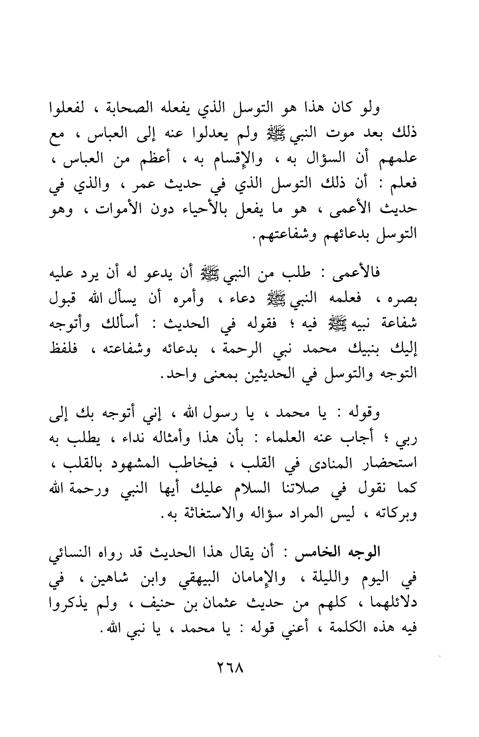 الوجه الخامس: أن يقال: هذا الحديث قد رواه النسائي في اليوم والليلة، والإمامان البيهقي وابن شاهين في دلائلهما، كلهم من حديث عثمان بن حنيف، ولم يذكروا فيه هذه الكلمة، أعني قوله: (يا محمد، يا نبي الله) .