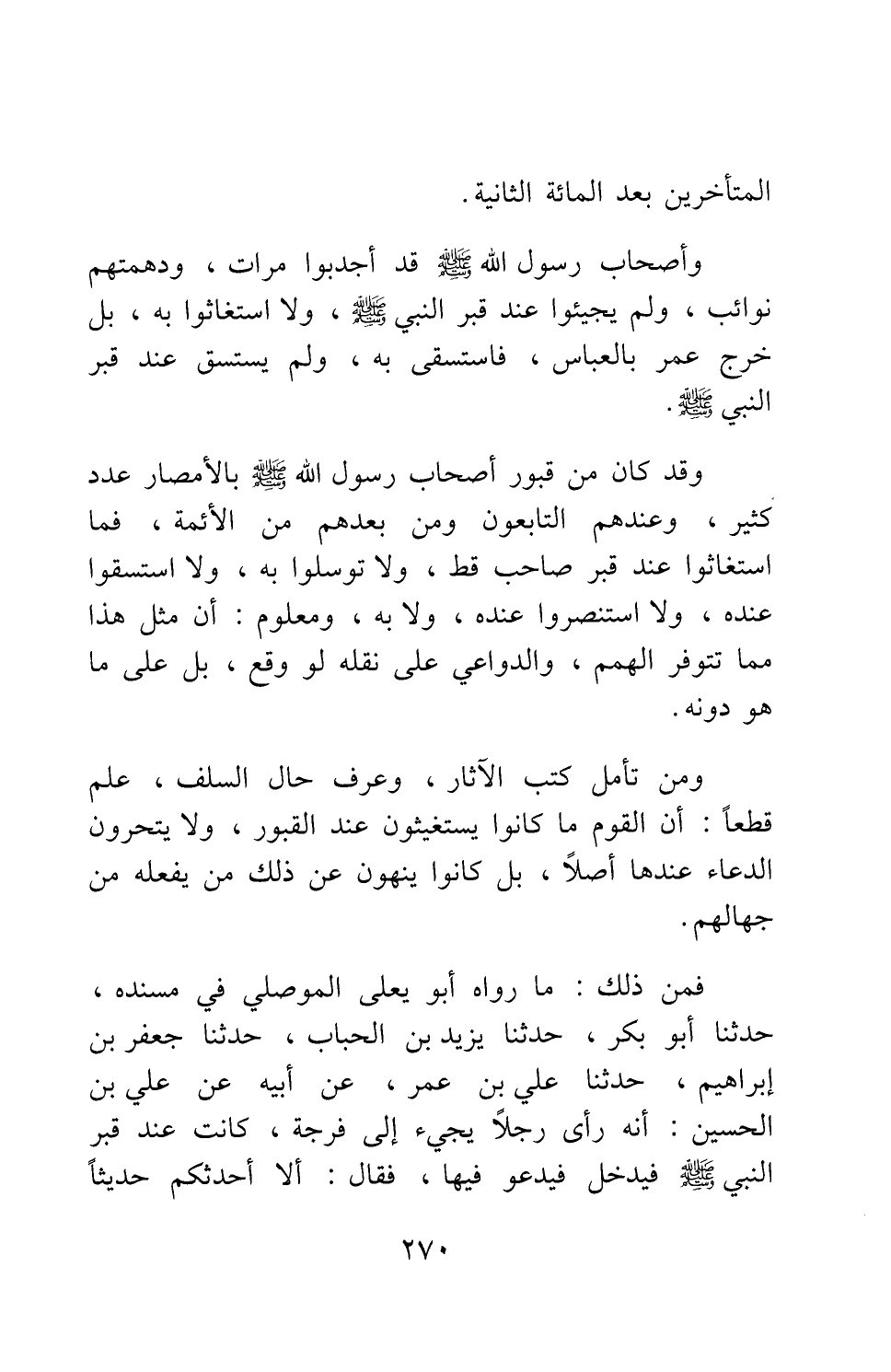 ومن تأمل كتب الآثار، وعرف حال السلف، علم قطعا أن القوم ما كانوا يستغيثون عند القبور، ولا يتحرون الدعاء عندها أصلا، بل كانوا ينهون عن ذلك من يفعله من جهالهم.
