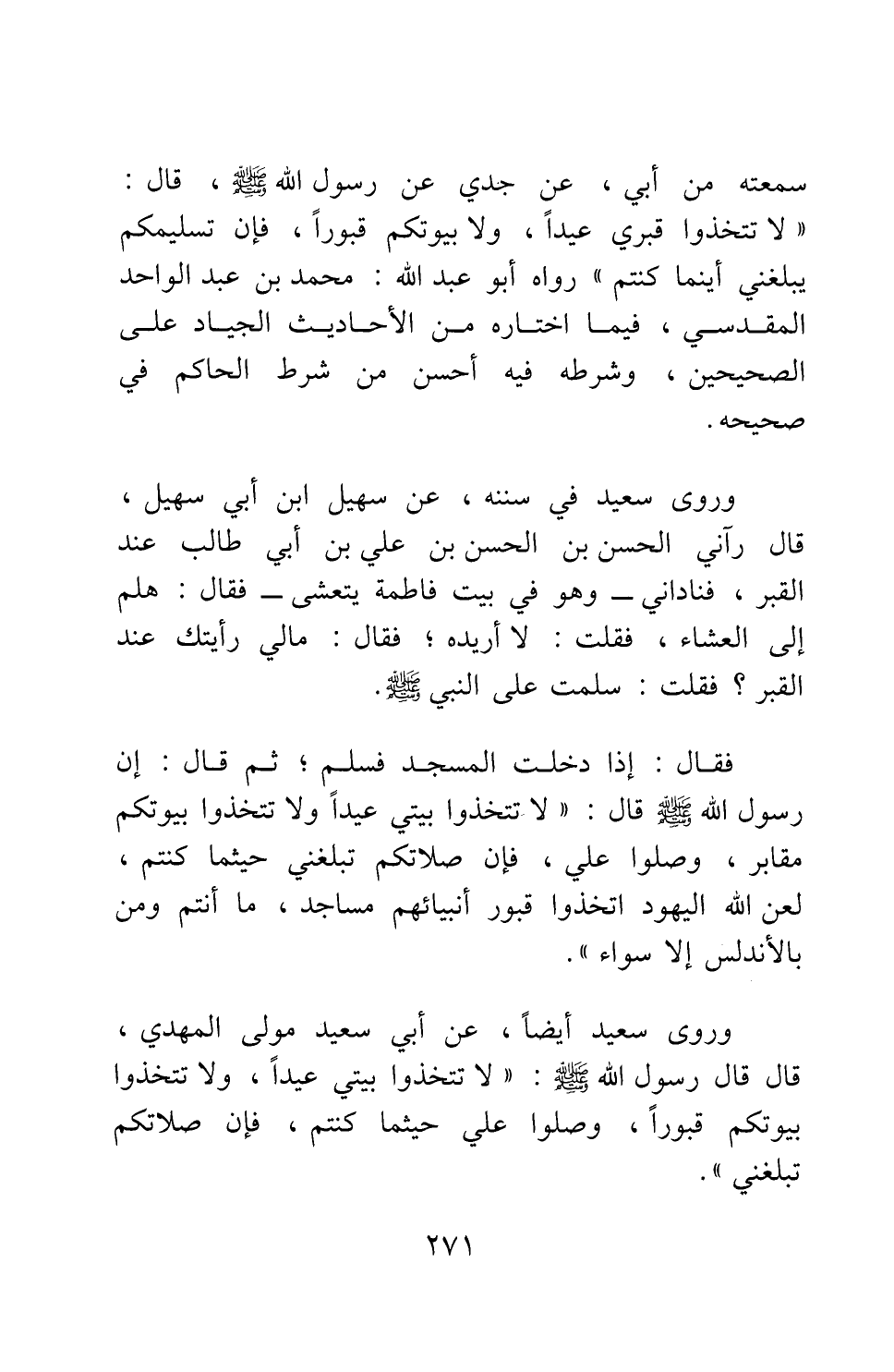 سمعته من أبي، عن جدي عن رسول الله صلى الله عليه وسلم قال: " لا تتخذوا قبري عيدا، ولا بيوتكم قبورا؛ فإن تسليمكم يبلغني أينما كنتم " 1 رواه أبو عبد الله محمد بن عبد الواحد المقدسي، فيما اختاره من الأحاديث الجياد على الصحيحين، وشرطه فيه أحسن من شرط الحاكم في صحيحه.