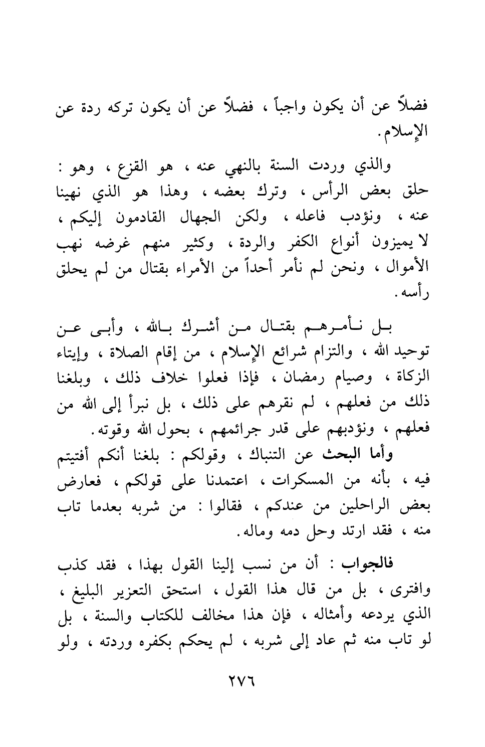 والذي وردت السنة بالنهي عنه، هو القزع، وهو: حلق بعض الرأس، وترك بعضه، وهذا هو الذي نهينا عنه، ونؤدب فاعله؛ ولكن الجهال القادمون إليكم، لا يميزون أنواع الكفر والردة، وكثير منهم غرضه نهب الأموال، ونحن لم نأمر أحدا من الأمراء بقتال من لم يحلق رأسه.