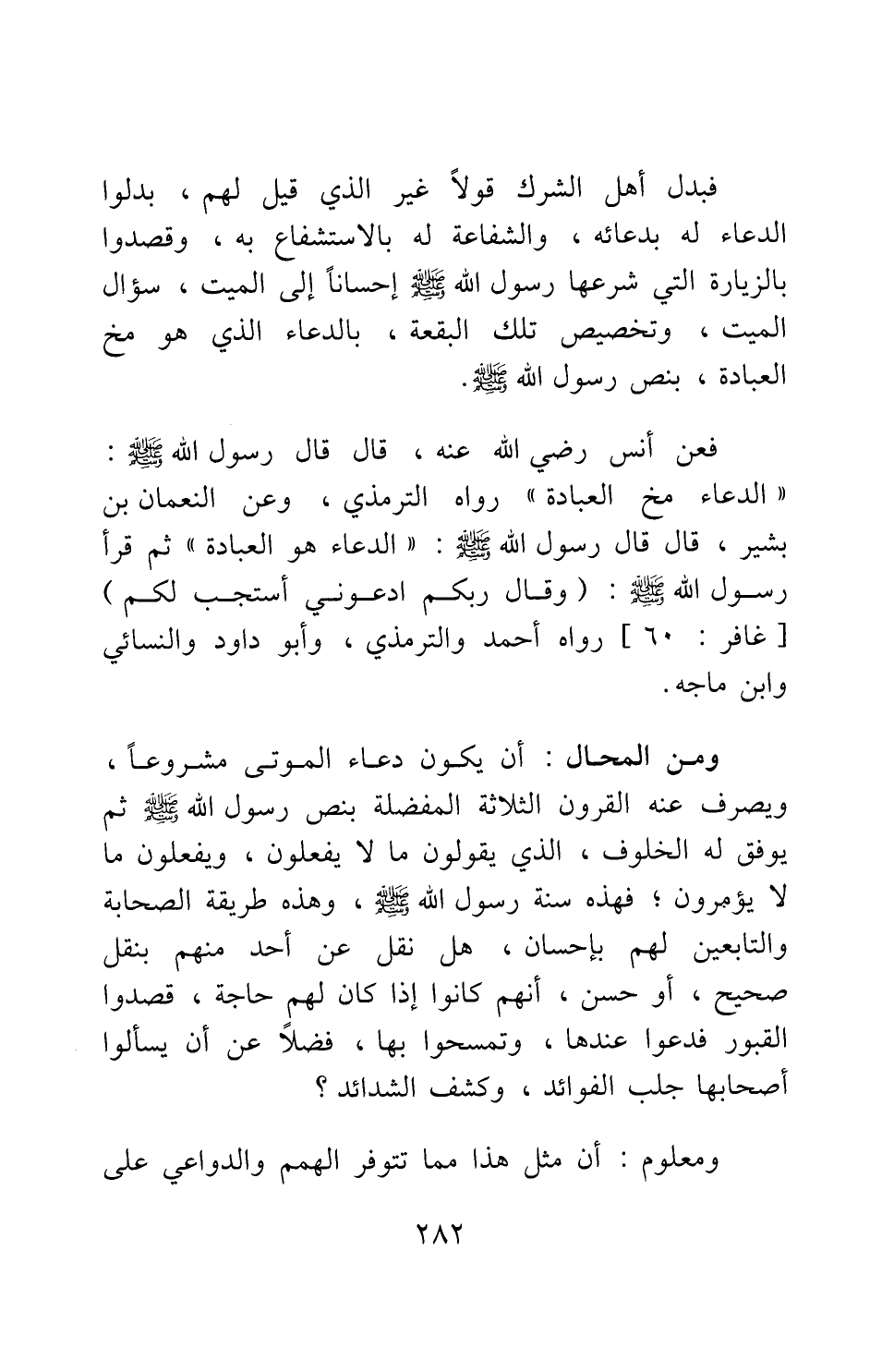 فبدل أهل الشرك قولا غير الذي قيل لهم: بدلوا الدعاء له بدعائه، والشفاعة له بالاستشفاع وبه، وقصدوا بالزيارة التي شرعها رسول الله صلى الله عليه وسلم إحسانا إلى الميت، سؤال الميت، وتخصيص تلك البقعة بالدعاء الذي هو مخ العبادة، بنص رسول الله صلى الله عليه وسلم.