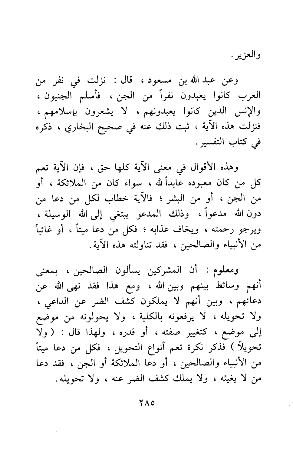 وهذه الأقوال في معنى الآية كلها حق، فإن الآية تعم كل من كان معبوده عابدا الله، سواء كان من الملائكة، أو من الجن، أو من البشر؛ فالآية خطاب لكل من دعا من دون الله مدعوا، وذلك المدعو يبتغي إلى الله الوسيلة، ويرجو رحمته، ويخاف عذابه؛ فكل من دعا ميتا، أو غائبا من الأنبياء والصالحين، فقد تناولته هذه الآية.