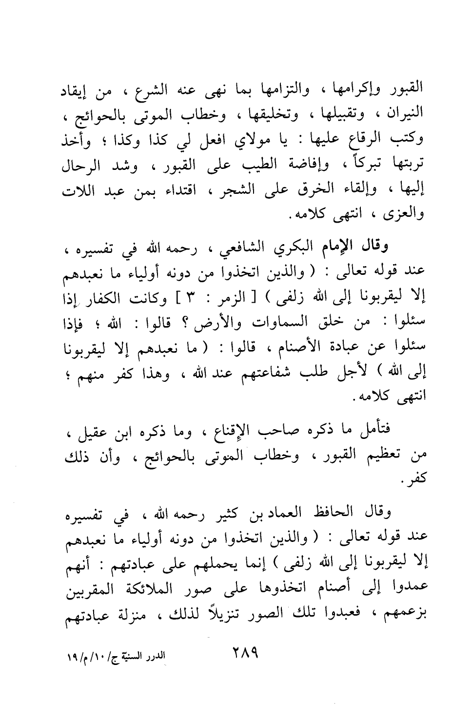 وقال الإمام البكري الشافعي، رحمه الله، في تفسيره، عند قوله تعالى: {وَالَّذِينَ اتَّخَذُوا مِنْ دُونِهِ أَوْلِيَاءَ مَا نَعْبُدُهُمْ إِلَّا لِيُقَرِّبُونَا إِلَى اللَّهِ زُلْفَى} 1: وكانت الكفار إذا سئلوا: من خلق السماوات والأرض؟ قالوا: الله، فإذا سئلوا عن عبادة الأصنام، قالوا: {مَا نَعْبُدُهُمْ إِلَّا لِيُقَرِّبُونَا إِلَى اللَّهِ} 2، لأجل طلب شفاعتهم عند الله؛ وهذا كفر منهم، انتهى كلامه.
