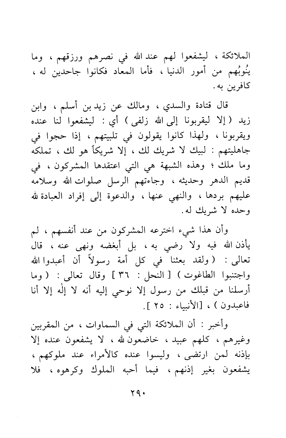 قال قتادة والسدي، ومالك عن زيد بن أسلم، وابن زيد {إِلَّا لِيُقَرِّبُونَا إِلَى اللَّهِ زُلْفَى} 1 أي: ليشفعوا لنا عنده ويقربونا، ولهذا كانوا يقولون في تلبيتهم، إذا حجوا في جاهليتهم: لبيك لا شريك لك، إلا شريكا هو لك، تملكه وما ملك. وهذه الشبهة هي التي اعتقدها المشركون، في قديم الدهر وحديثه، وجاءتهم الرسل صلوات الله وسلامه عليهم بردها، والنهي عنها، والدعوة إلى إفراد العبادة لله وحده لا شريك له، وأن هذا شيء اخترعه المشركون من عند أنفسهم، لم يأذن الله فيه ولا رضي به، بل أبغضه ونهى عنه، قال تعالى: {وَلَقَدْ بَعَثْنَا فِي كُلِّ أُمَّةٍ رَسُولاً أَنِ اعْبُدُوا اللَّهَ وَاجْتَنِبُوا الطَّاغُوتَ} 2، وقال تعالى: {وَمَا أَرْسَلْنَا مِنْ قَبْلِكَ مِنْ رَسُولٍ إِلَّا نُوحِي إِلَيْهِ أَنَّهُ لا إِلَهَ إِلَّا أَنَا فَاعْبُدُونِ} 3.