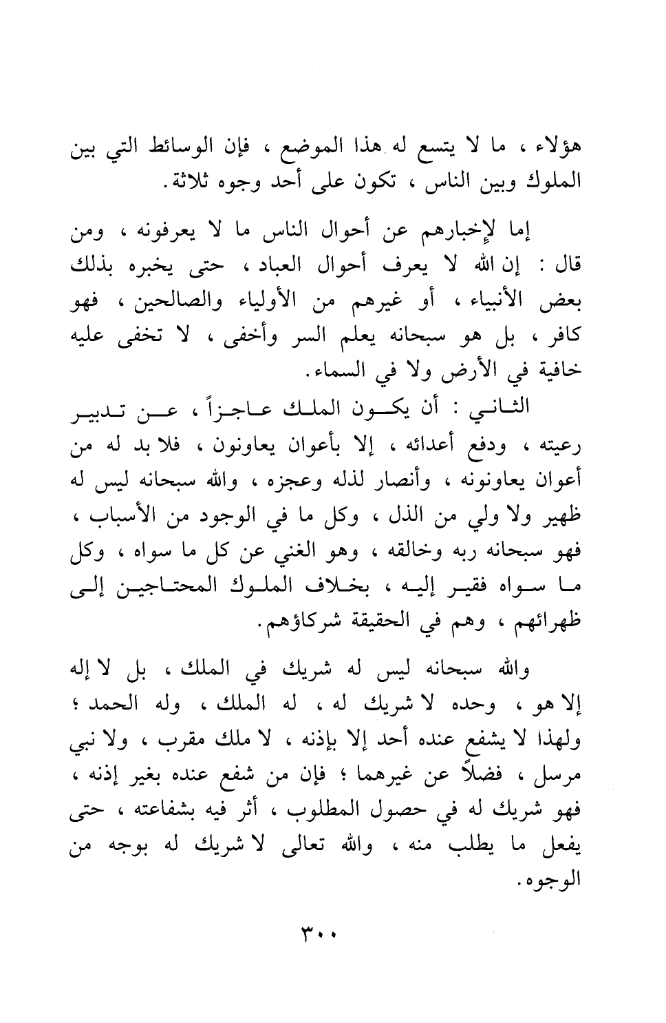الثاني: أن يكون الملك عاجزا عن تدبير رعيته، ودفع أعدائه، إلا بأعوان يعاونون، فلا بد له من أعوان يعاونونه، وأنصار لذله وعجزه؛ والله سبحانه ليس له ظهير ولا ولي من الذل، وكل ما في الوجود من الأسباب، فهو سبحانه ربه وخالقه، وهو الغني عن كل ما سواه، وكل ما سواه فقير إليه، بخلاف الملوك المحتاجين إلى ظهرائهم، وهم في الحقيقة شركاؤهم.
