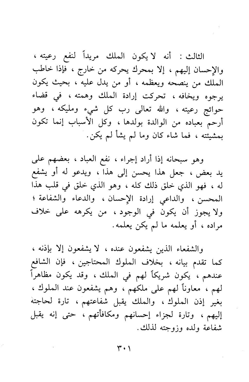 الثالث: أنه لا يكون الملك مريدا لنفع رعيته، والإحسان إليهم، إلا بمحرك يحركة من خارج، فإذا خاطب الملك من ينصحه ويعظمه، أو من يدل عليه، بحيث يكون يرجوه ويخافه، تحركت إرادة الملك وهمته، في قضاء حوائج رعيته؛ والله تعالى رب كل شيء ومليكه، وهو أرحم بعباده من الوالدة بولدها، وكل الأسباب إنما تكون بمشيئته، فما شاء كان وما لم يشأ لم يكن.