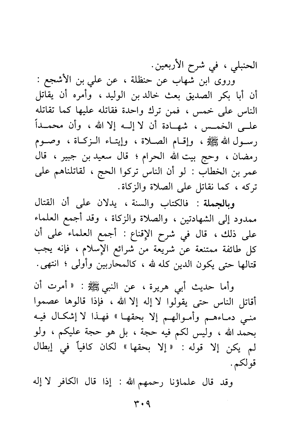 وبالجملة: فالكتاب والسنة، يدلان على أن القتال ممدود إلى الشهادتين، والصلاة والزكاة؛ وقد أجمع العلماء على ذلك، قال في شرح "الإقناع": أجمع العلماء على أن كل طائفة ممتنعة عن شريعة من شرائع الإسلام، فإنه يجب قتالها حتى يكون الدين كله لله، كالمحاربين وأولى; انتهى.