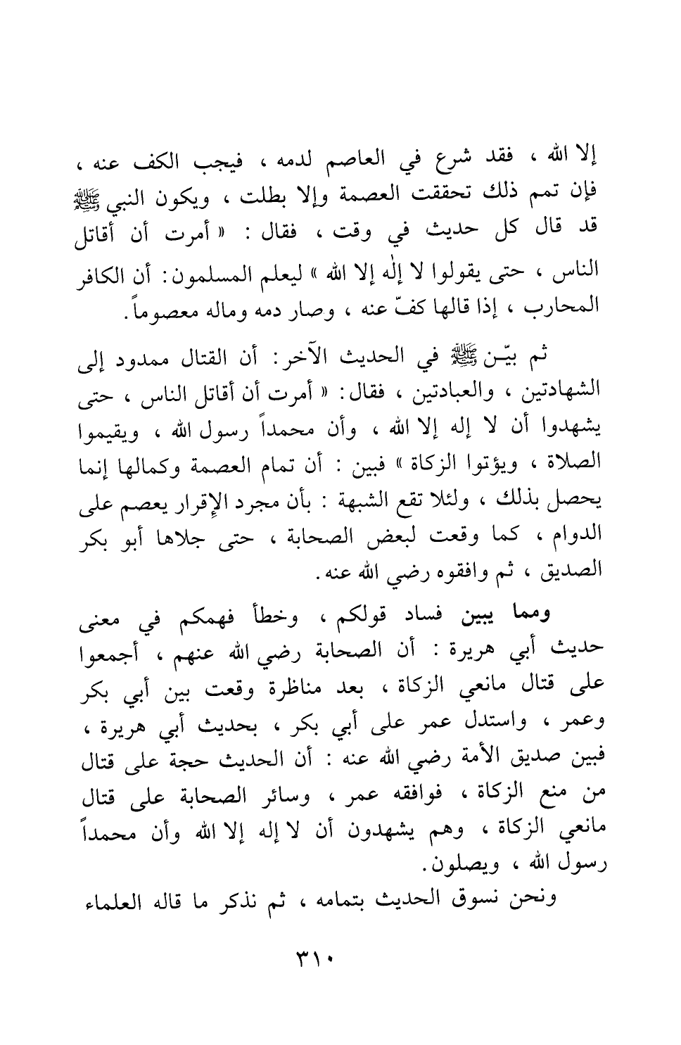 ثم بين صلى الله عليه وسلم في الحديث الآخر: أن القتال ممدود إلى الشهادتين، والعبادتين، فقال: " أمرت أن أقاتل الناس، حتى يشهدوا أن لا إله إلا الله، وأن محمدا رسول الله، ويقيموا الصلاة، ويؤتوا الزكاة " 2 فبين: أن تمام العصمة وكمالها إنما يحصل بذلك، ولئلا تقع الشبهة بأن مجرد الاقرار يعصم على الدوام، كما وقعت لبعض الصحابة، حتى جلاها أبو بكر الصديق، ثم وافقوه رضي الله عنه.