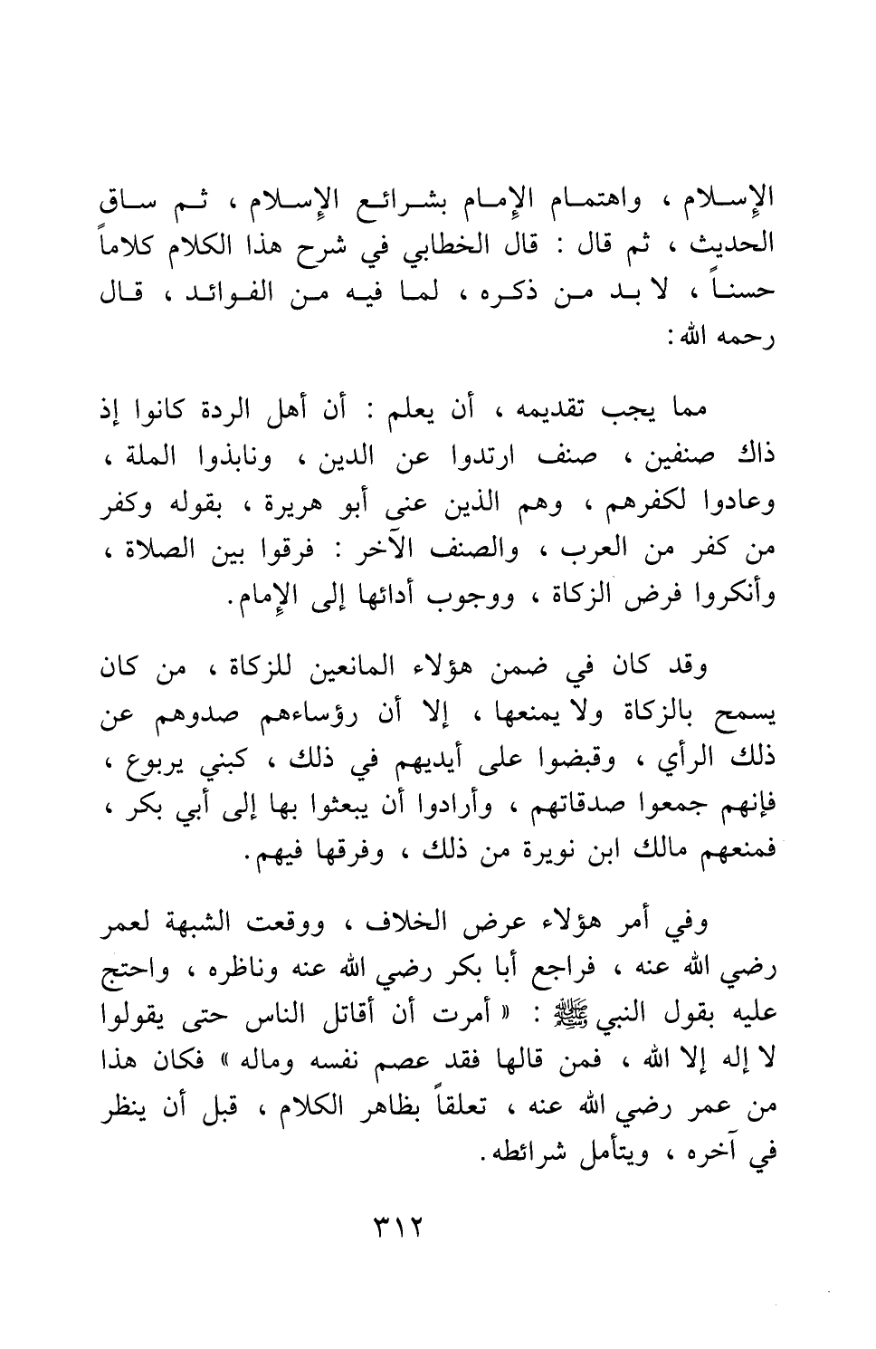 وفي أمر هؤلاء عرض الخلاف، ووقعت الشبهة لعمر رضي الله عنه، فراجع أبا بكر رضي الله عنه وناظره، واحتج عليه بقول النبي صلى الله عليه وسلم:" أمرت أن أقاتل الناس حتى يقولوا: لا إله إلا الله؛ فمن قالها فقد عصم نفسه وماله" 1 فكان هذا من عمر رضي الله عنه تعلقا بظاهر الكلام، قبل أن ينظر في آخره، ويتأمل شرائطه.