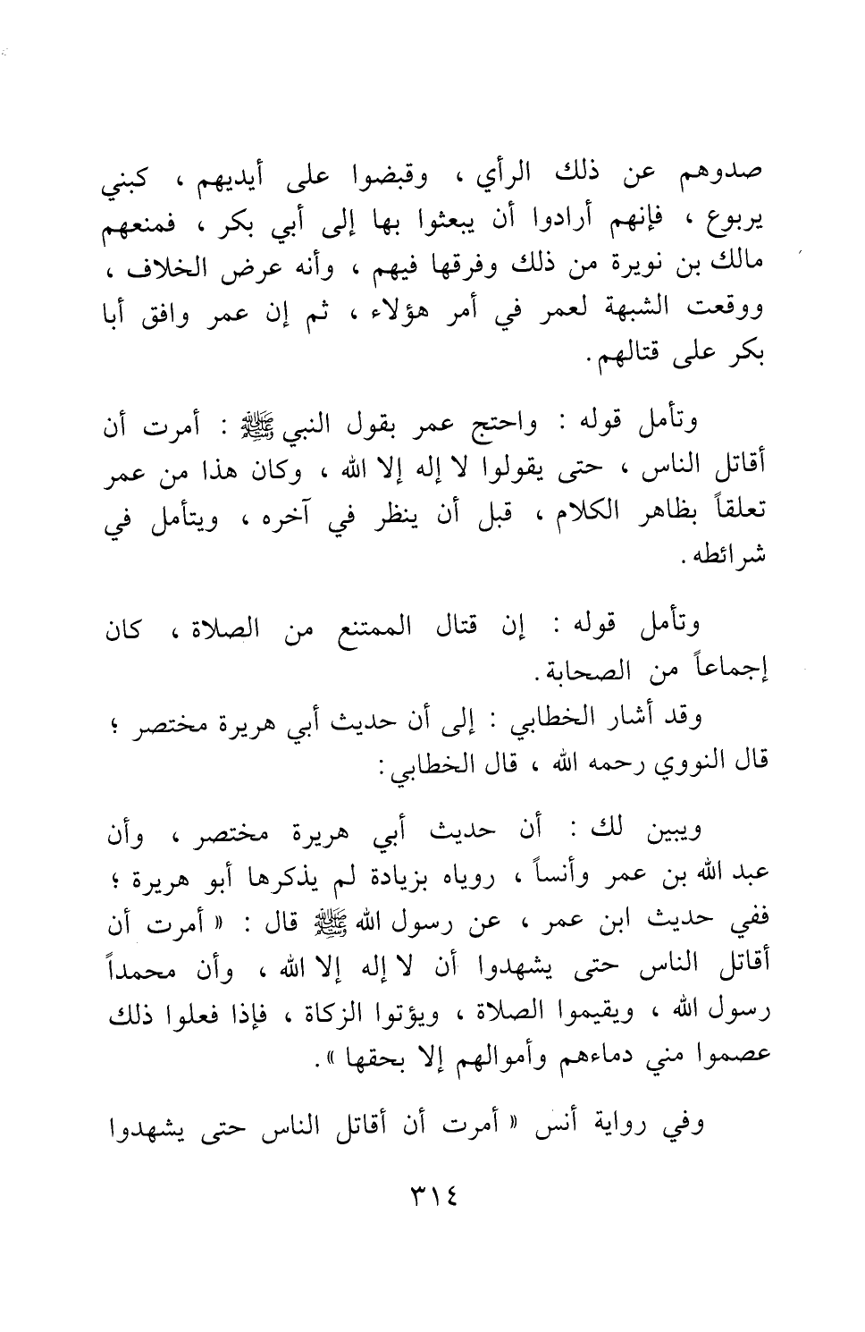وتأمل قوله: واحتج عمر بقول النبي صلى الله عليه وسلم: " أمرت أن أقاتل الناس، حتى يقولوا: لا إله إلا الله " 1، وكان هذا من عمر تعلقا بظاهر الكلام، قبل أن ينظر في آخره، ويتأمل في شرائطه.