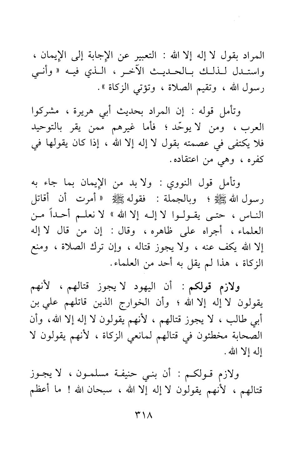 ولازم قولكم: أن اليهود لا يجوز قتالهم، لأنهم يقولون لا إله إلا الله; وأن الخوارج الذين قاتلهم علي بن أبي طالب، لا يجوز قتالهم، لأنهم يقولون لا إله إلا الله، وأن الصحابة مخطئون في قتالهم لمانعي الزكاة، لأنهم يقولون لا إله إلا الله.