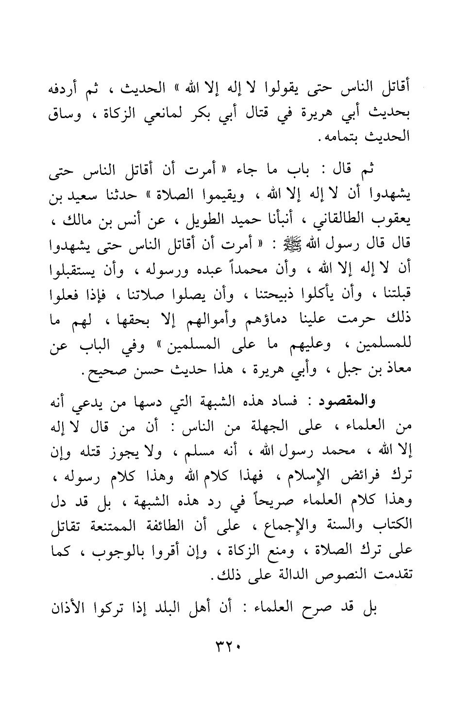 ثم قال: باب ما جاء " أمرت أن أقاتل الناس حتى يشهدوا أن لا إله إلا الله، ويقيموا الصلاة " 2: حدثنا سعيد بن يعقوب الطالقاني، أنبأنا حميد الطويل، عن أنس بن مالك، قال: قال رسول الله صلى الله عليه وسلم: " أمرت أن أقاتل الناس حتى يشهدوا أن لا إله إلا الله، وأن محمدا عبده ورسوله، وأن يستقبلوا قبلتنا، وأن يأكلوا ذبيحتنا، وأن يصلوا صلاتنا؛ فإذا فعلوا ذلك حرمت علينا دماؤهم وأموالهم إلا بحقها، لهم ما للمسلمين، وعليهم ما على المسلمين " 3، وفي الباب عن معاذ بن جبل، وأبي هريرة، هذا حديث حسن صحيح.