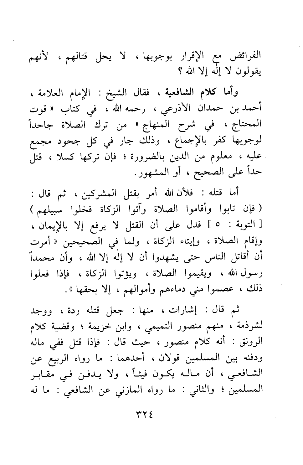 وأما كلام الشافعية، فقال الشيخ الإمام العلامة، أحمد بن حمدان الأذرعي، رحمه الله، في كتاب "قوت المحتاج، في شرح المنهاج": من ترك الصلاة جاحدا لوجوبها كفر بالإجماع، وذلك جار في كل جحود مجمع عليه، معلوم من الدين بالضرورة; فإن تركها كسلا، قتل حدا على الصحيح، أو المشهور.