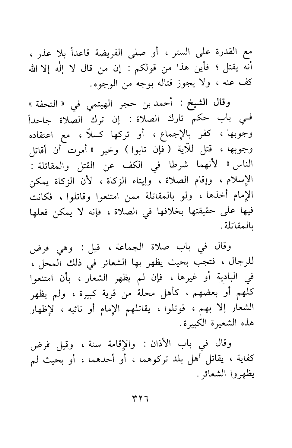 وقال الشيخ: أحمد بن حجر الهيتمي في "التحفة" في باب حكم تارك الصلاة: إن ترك الصلاة جاحدا وجوبها، كفر بالإجماع، أو تركها كسلا، مع اعتقاده وجوبها، قتل للآية: {فَإِنْ تَابُوا} ، وخبر: " أمرت أن أقاتل الناس" 1، لأنهما شرطا في الكف عن القتل والمقاتلة: الإسلام، وإقام الصلاة، وإيتاء الزكاة، لأن الزكاة يمكن الإمام أخذها، ولو بالمقاتلة ممن امتنعوا وقاتلوا، فكانت فيها على حقيقتها بخلافها في الصلاة، فإنه لا يمكن فعلها بالمقاتلة.