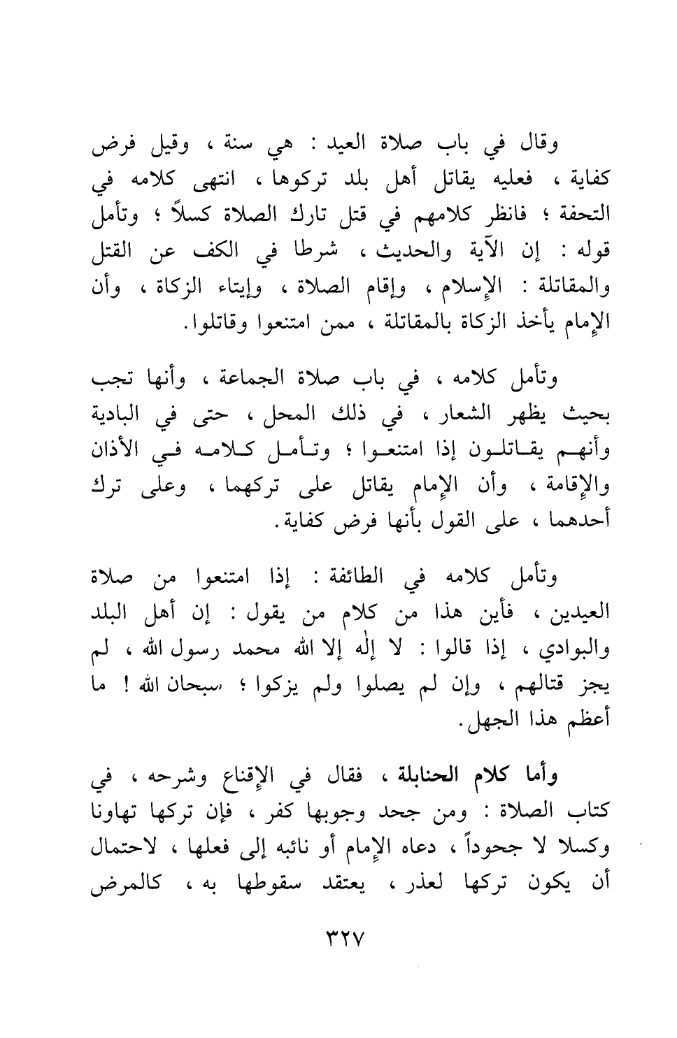وتأمل كلامه، في باب صلاة الجماعة: وأنها تجب بحيث يظهر الشعار، في ذلك المحل، حتى في البادية وأنهم يقاتلون إذا امتنعوا; وتأمل كلامه في الأذان والإقامة، وأن الإمام يقاتل على تركهما، وعلى ترك أحدهما، على القول بأنها فرض كفاية. وتأمل كلامه في الطائفة: إذا امتنعوا من صلاة العيدين؛ فأين هذا من كلام من يقول: إن أهل البلد والبوادي، إذا قالوا: لا إله إلا الله، محمد رسول الله، لم يجز قتالهم، وإن لم يصلوا ولم يزكوا; سبحان الله! ما أعظم هذا الجهل!