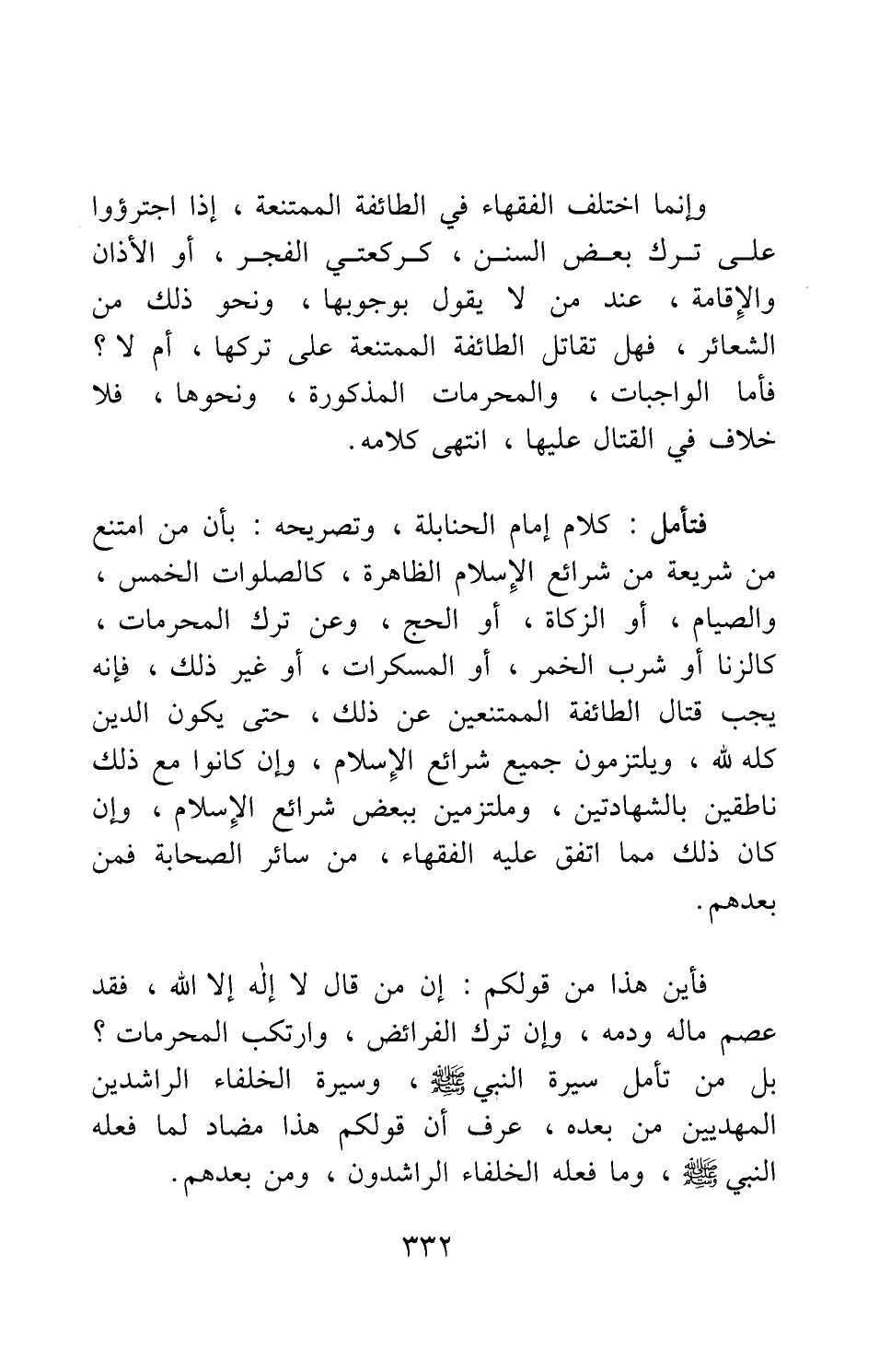 فتأمل: كلام إمام الحنابلة، وتصريحه بأن من امتنع من شريعة من شرائع الإسلام الظاهرة، كالصلوات الخمس، والصيام، أو الزكاة، أو الحج، وعن ترك المحرمات، كالزنى أو شرب الخمر، أو المسكرات، أو غير ذلك، فإنه يجب قتال الطائفة الممتنعين عن ذلك، حتى يكون الدين كله لله، ويلتزمون جميع شرائع الإسلام، وإن كانوا مع ذلك ناطقين بالشهادتين، وملتزمين ببعض شرائع الإسلام، وإن كان ذلك مما اتفق عليه الفقهاء، من سائر الصحابة فمن بعدهم.