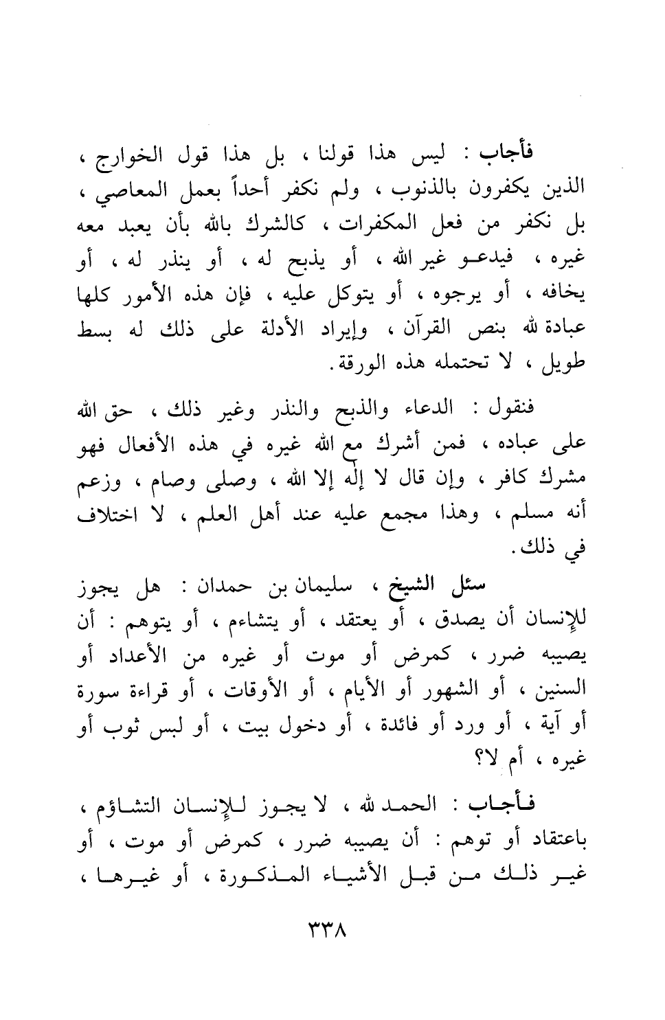 فأجاب: ليس هذا قولنا، بل هذا قول الخوارج، الذين يكفرون بالذنوب، ولم نكفر أحدا بعمل المعاصي؛ بل نكفر من فعل المكفرات، كالشرك بالله بأن يعبد معه غيره، فيدعو غير الله، أو يذبح له، أو ينذر له، أو يخافه، أو يرجوه، أو يتوكل عليه، فإن هذه الأمور كلها عبادة لله بنص القرآن، وإيراد الأدلة على ذلك له بسط طويل، لا تحتمله هذه الورقة.
