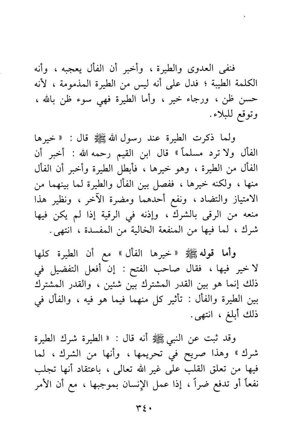 ولما ذكرت الطيرة عند رسول الله صلى الله عليه وسلم قال: " خيرها الفأل، ولا ترد مسلما " 1. قال ابن القيم رحمه الله: أخبر أن الفأل من الطيرة، وهو خيرها، فأبطل الطيرة وأخبر أن الفأل منها، ولكنه خيرها، ففصل بين الفأل والطيرة لما بينهما من الامتياز والتضاد، ونفع أحدهما ومضرة الآخر؛ ونظير هذا منعه من الرقى بالشرك، وإذنه في الرقية إذا لم يكن فيها شرك، لما فيها من المنفعة الخالية من المفسدة، انتهى.