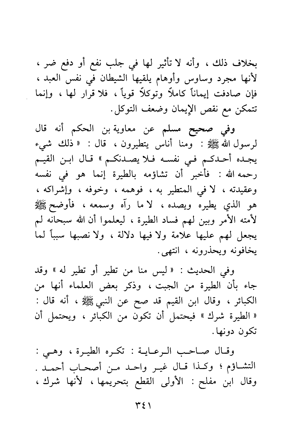 وفي صحيح مسلم عن معاوية بن الحكم أنه قال لرسول الله صلى الله عليه وسلم: " ومنا أناس يتطيرون، قال: ذلك شيء يجده أحدكم في نفسه، فلا يصدنكم " 1. قال ابن القيم رحمه الله: فأخبر أن تشاؤمة بالطيرة إنما هو في نفسه وعقيدته، لا في المتطير به؛ فوهمه، وخوفه، وإشراكه، هو الذي يطيره ويصده، لا ما رآه وسمعه؛ فأوضح صلى الله عليه وسلم لأمته الأمر وبين لهم فساد الطيرة، ليعلموا أن الله سبحانه لم يجعل لهم عليها علامة ولا فيها دلالة، ولا نصبها سببا لما يخافونه ويحذرونه، انتهى.