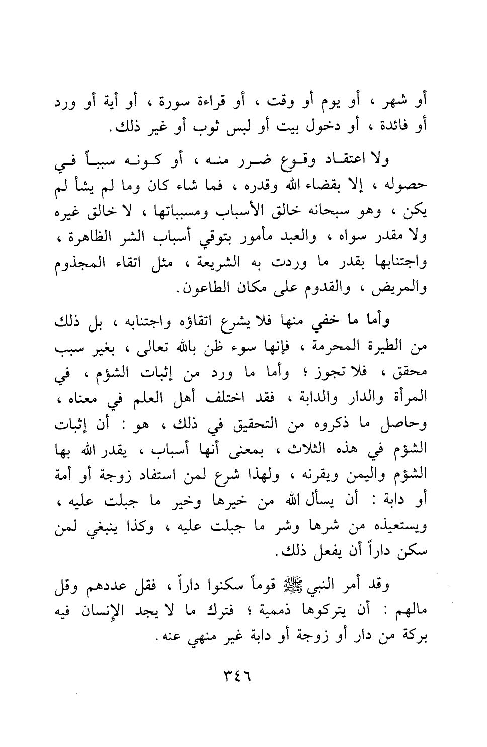 وأما ما خفي منها، فلا يشرع اتقاؤه واجتنابه، بل ذلك من الطيرة المحرمة، فإنها سوء ظن بالله تعالى، بغير سبب محقق، فلا تجوز; وأما ما ورد من إثبات الشؤم، في المرأة والدار والدابة، فقد اختلف أهل العلم في معناه؛ وحاصل ما ذكروه من التحقيق في ذلك، هو: أن إثبات الشؤم في هذه الثلاث، بمعنى أنها أسباب، يقدر الله بها الشؤم واليمن ويقرنه، ولهذا شرع لمن استفاد زوجة أو أمة أو دابة، أن يسأل الله من خيرها وخير ما جبلت عليه، ويستعيذه من شرها وشر ما جبلت عليه، وكذا ينبغي لمن سكن دارا أن يفعل ذلك.