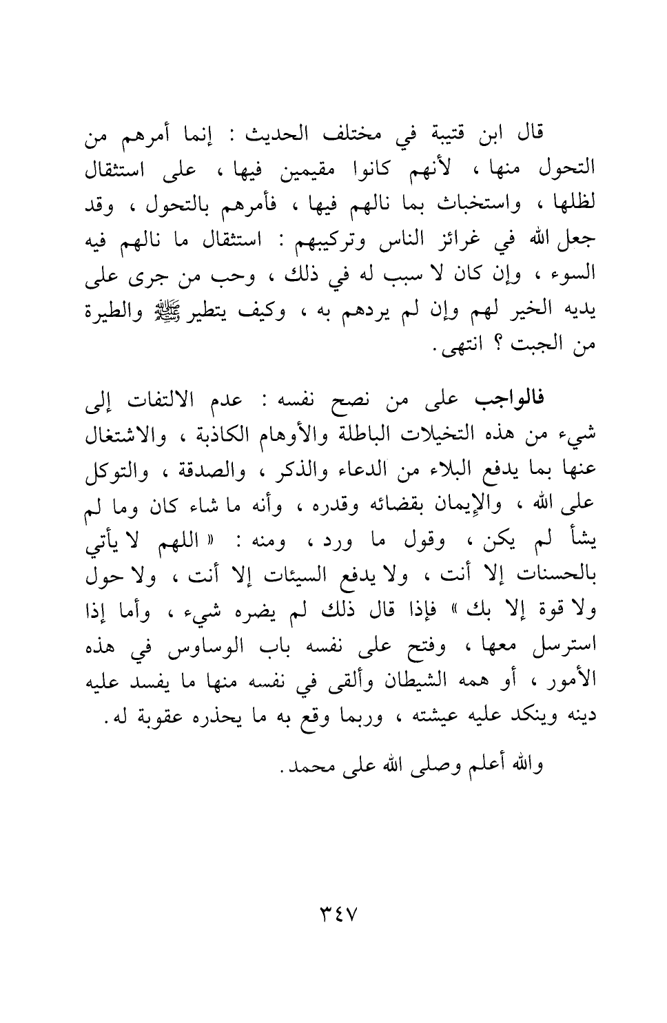 فالواجب على من نصح نفسه: عدم الالتفات إلى شيء من هذه التخيلات الباطلة والأوهام الكاذبة، والاشتغال عنها بما يدفع البلاء من الدعاء والذكر، والصدقة، والتوكل على الله، والإيمان بقضائه وقدره، وأنه ما شاء كان وما لم يشأ لم يكن، وقول ما ورد، ومنه: " اللهم لا يأتي بالحسنات إلا أنت، ولا يدفع السيئات إلا أنت، ولا حول ولا قوة إلا بك" 1 فإذا قال ذلك لم يضره شيء، وأما إذا استرسل معها، وفتح على نفسه باب الوساوس في هذه الأمور، أو همه الشيطان وألقى في نفسه منها ما يفسد عليه دينه وينكد عليه عيشته، وربما وقع به ما يحذره، عقوبة له. والله أعلم وصلى الله على محمد.