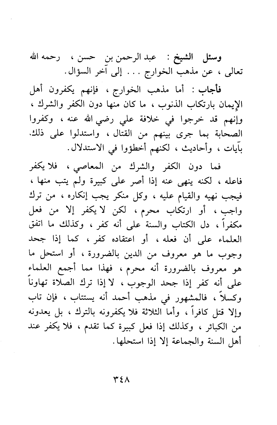 وسئل الشيخ عبد الرحمن بن حسن، رحمه الله تعالى، عن مذهب الخوارج ... إلى آخر السؤال.