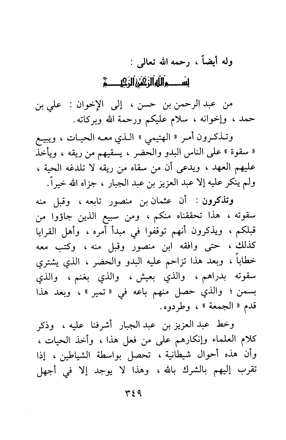 من عبد الرحمن بن حسن، إلى الإخوان: علي بن حمد، وإخوانه، سلام عليكم ورحمة الله وبركاته. وتذكرون أمر "الهتيمي" الذي معه الحيات، ويبيع "سقوة" على الناس البدو الحضر، يسقيهم من ريقه، ويأخذ عليهم العهد، ويدعي أن من سقاه من ريقه لا تلدغه الحية، ولم ينكر عليه إلا عبد العزيز بن عبد الجبار، جزاه الله خيرا.