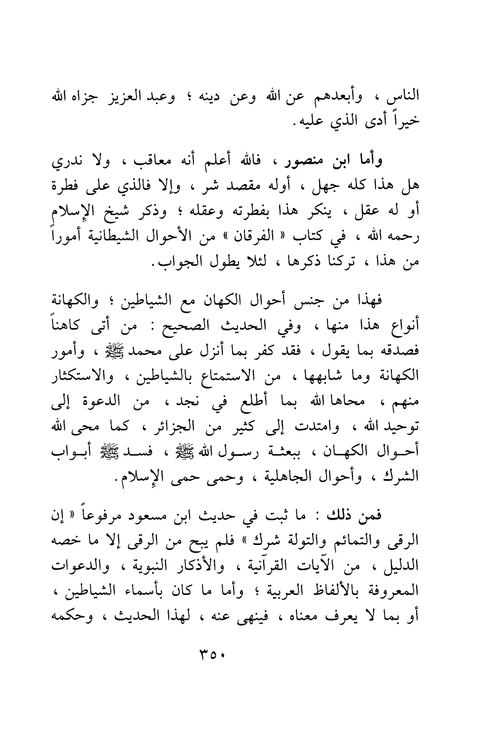 فهذا من جنس أحوال الكهان مع الشياطين; والكهانة أنواع هذا منها، وفي الحديث الصحيح: " من أتى كاهنا فصدقه بما يقول، فقد كفر بما أنزل على محمد صلى الله عليه وسلم " 1. وأمور الكهانة وما شابهها، من الاستمتاع بالشياطين، والاستكثار منهم، محاها الله بما أطلع في نجد من الدعوة إلى توحيد الله، وامتدت إلى كثير من الجزائر، كما محا الله أحوال الكهان، ببعثة رسول الله صلى الله عليه وسلم، فسدّ صلى الله عليه وسلم أبواب الشرك، وأحوال الجاهلية، وحمى حمى الإسلام.