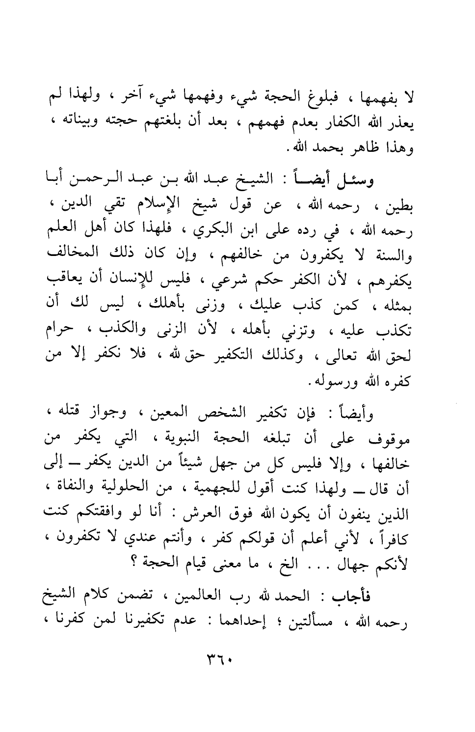 وسئل أيضا: الشيخ عبد الله بن عبد الرحمن أبا بطين، رحمه الله، عن قول شيخ الإسلام تقي الدين، رحمه الله، في رده على ابن البكري: فلهذا كان أهل العلم والسنة لا يكفّرون من خالفهم، وإن كان ذلك المخالف يكفرهم، لأن الكفر حكم شرعي؛ فليس للإنسان أن يعاقب بمثله، كمن كذب عليك، وزنى بأهلك، ليس لك أن تكذب عليه، وتزني بأهله، لأن الزنى والكذب، حرام لحق الله تعالى؛ وكذلك التكفير حق لله، فلا نكفر إلا من كفره الله ورسوله.