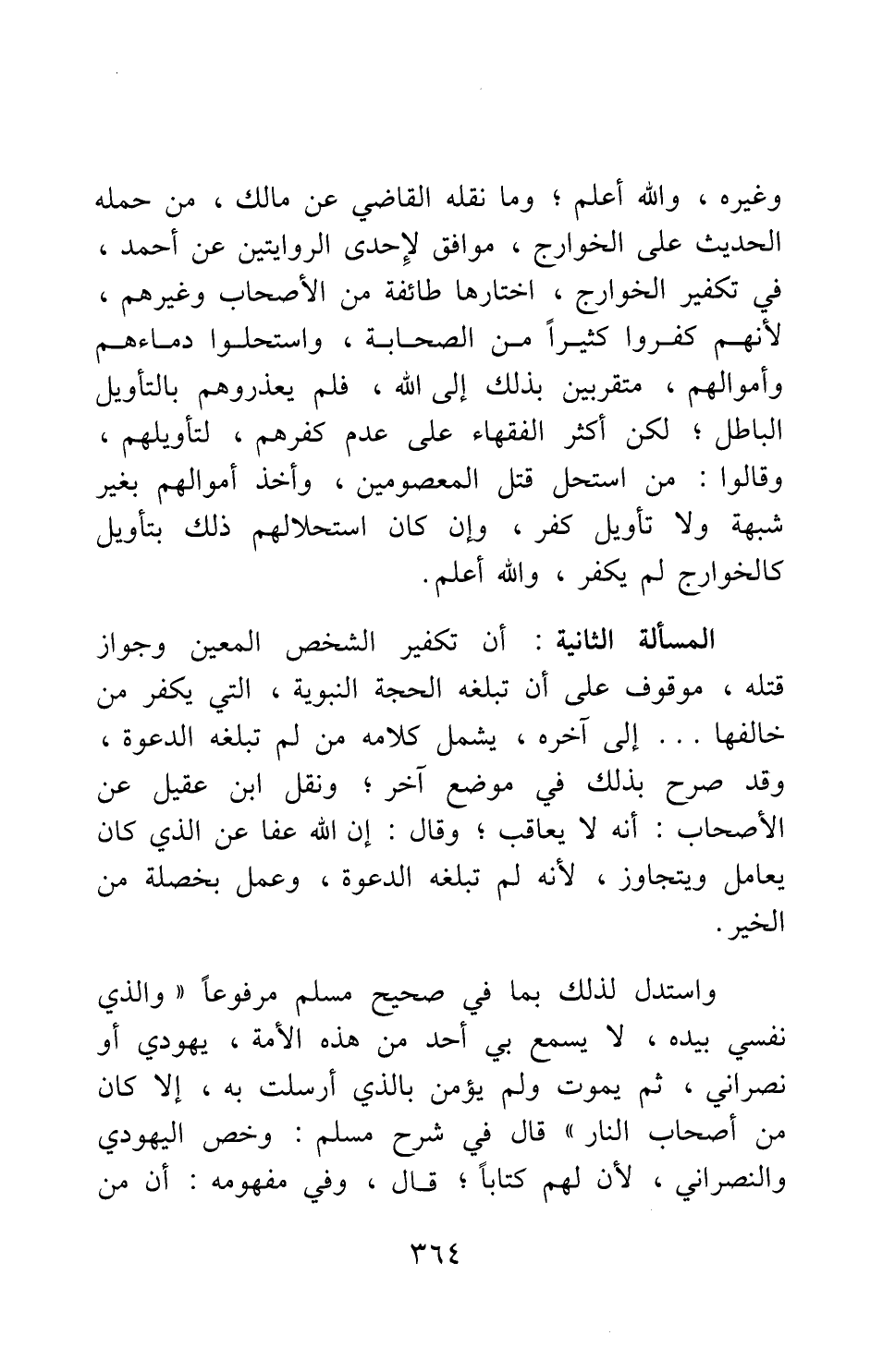 المسألة الثانية: أن تكفير الشخص المعين وجواز قتله، موقوف على أن تبلغه الحجة النبوية، التي يكفر من خالفها ... إلى آخره، يشمل كلامه من لم تبلغه الدعوة، وقد صرح بذلك في موضع آخر; ونقل ابن عقيل عن الأصحاب: أنه لا يعاقب; وقال: إن الله عفا عن الذي كان يعامل ويتجاوز، لأنه لم تبلغه الدعوة، وعمل بخصلة من الخير.