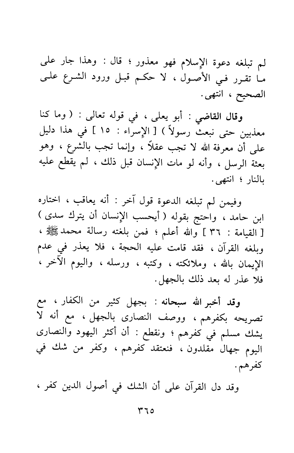 وقال القاضي أبو يعلى: في قوله تعالى: {وَمَا كُنَّا مُعَذِّبِينَ حَتَّى نَبْعَثَ رَسُولاً} 1: في هذا دليل على أن معرفة الله لا تجب عقلا، وإنما تجب بالشرع، وهو بعثة الرسل، وأنه لو مات الإنسان قبل ذلك، لم يقطع عليه بالنار; انتهى.