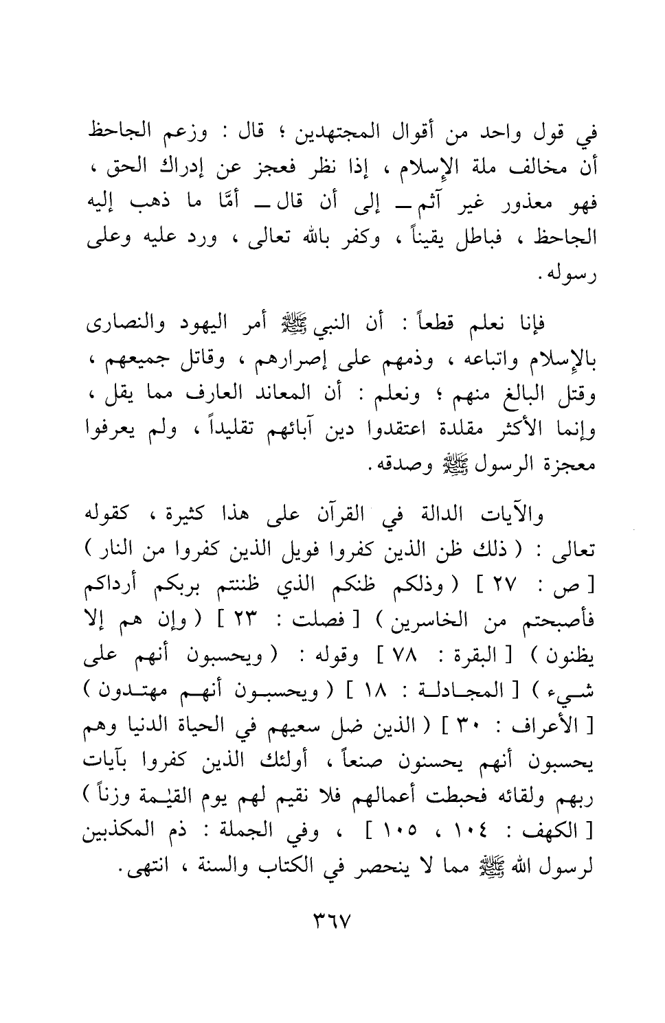 في قول واحد من أقوال المجتهدين، قال: وزعم الجاحظ أن مخالف ملة الإسلام، إذا نظر فعجز عن إدراك الحق، فهو معذور غير آثم، إلى أن قال:: أما ما ذهب إليه الجاحظ، فباطل يقينا، وكفر بالله تعالى، ورد عليه وعلى رسوله.