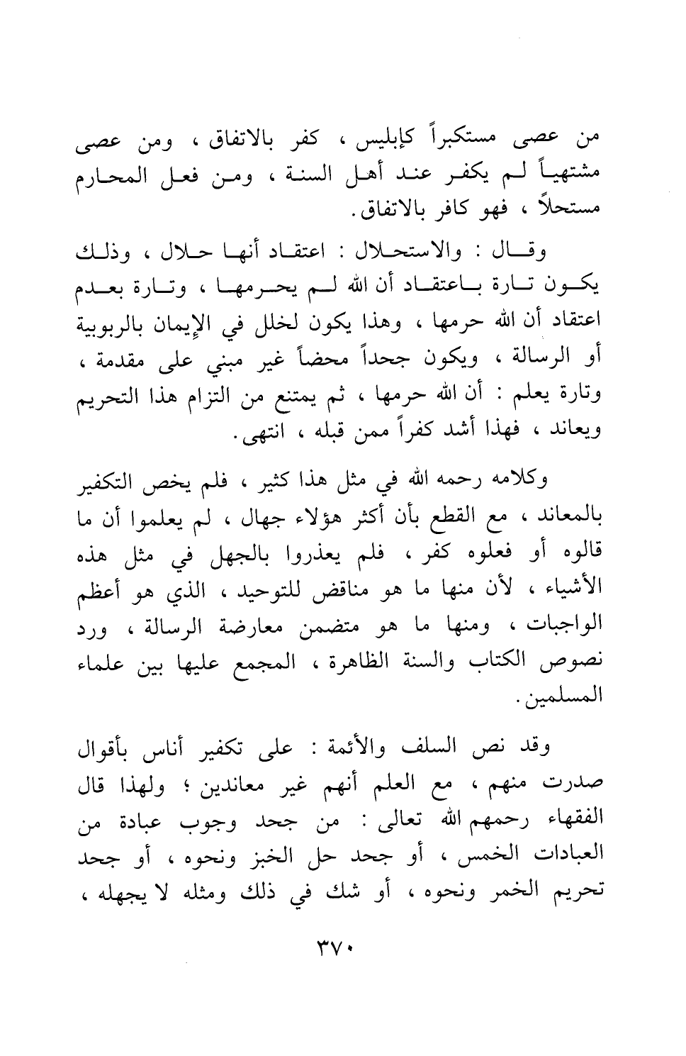 وكلامه رحمه الله في مثل هذا كثير، فلم يخص التكفير بالمعاند، مع القطع بأن أكثر هؤلاء جهال لم يعلموا أن ما قالوه أو فعلوه كفر؛ فلم يعذروا بالجهل في مثل هذه الأشياء، لأن منها ما هو مناقض للتوحيد، الذي هو أعظم الواجبات، ومنها ما هو متضمن معارضة الرسالة، ورد نصوص الكتاب والسنة الظاهرة المجمع عليها بين علماء المسلمين.