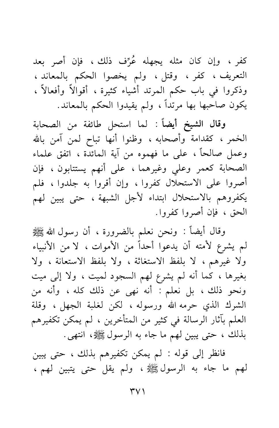 وقال الشيخ أيضا: لما استحل طائفة من الصحابة الخمر، كقدامة وأصحابه، وظنوا أنها تباح لمن آمن بالله وعمل صالحا، على ما فهموه من آية المائدة، اتفق علماء الصحابة كعمر وعلي وغيرهما، على أنهم يستتابون، فإن أصروا على الاستحلال كفروا، وإن أقروا به جلدوا؛ فلم يكفروهم بالاستحلال ابتداء لأجل الشبهة، حتى يبين لهم الحق، فإن أصروا كفروا.