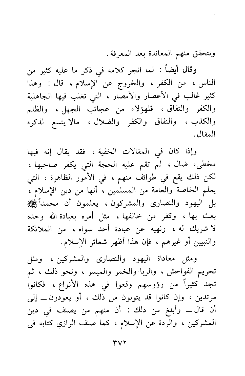ومثل معاداة اليهود والنصارى والمشركين، ومثل تحريم الفواحش، والربا والخمر والميسر، ونحو ذلك، ثم تجد كثيرا من رؤوسهم وقعوا في هذه الأنواع، فكانوا مرتدين، وإن كانوا قد يتوبون من ذلك، أو يعودون إلى أن قال: وأبلغ من ذلك: أن منهم من يصنف في دين المشركين، والردة عن الإسلام، كما صنف الرازي كتابه في