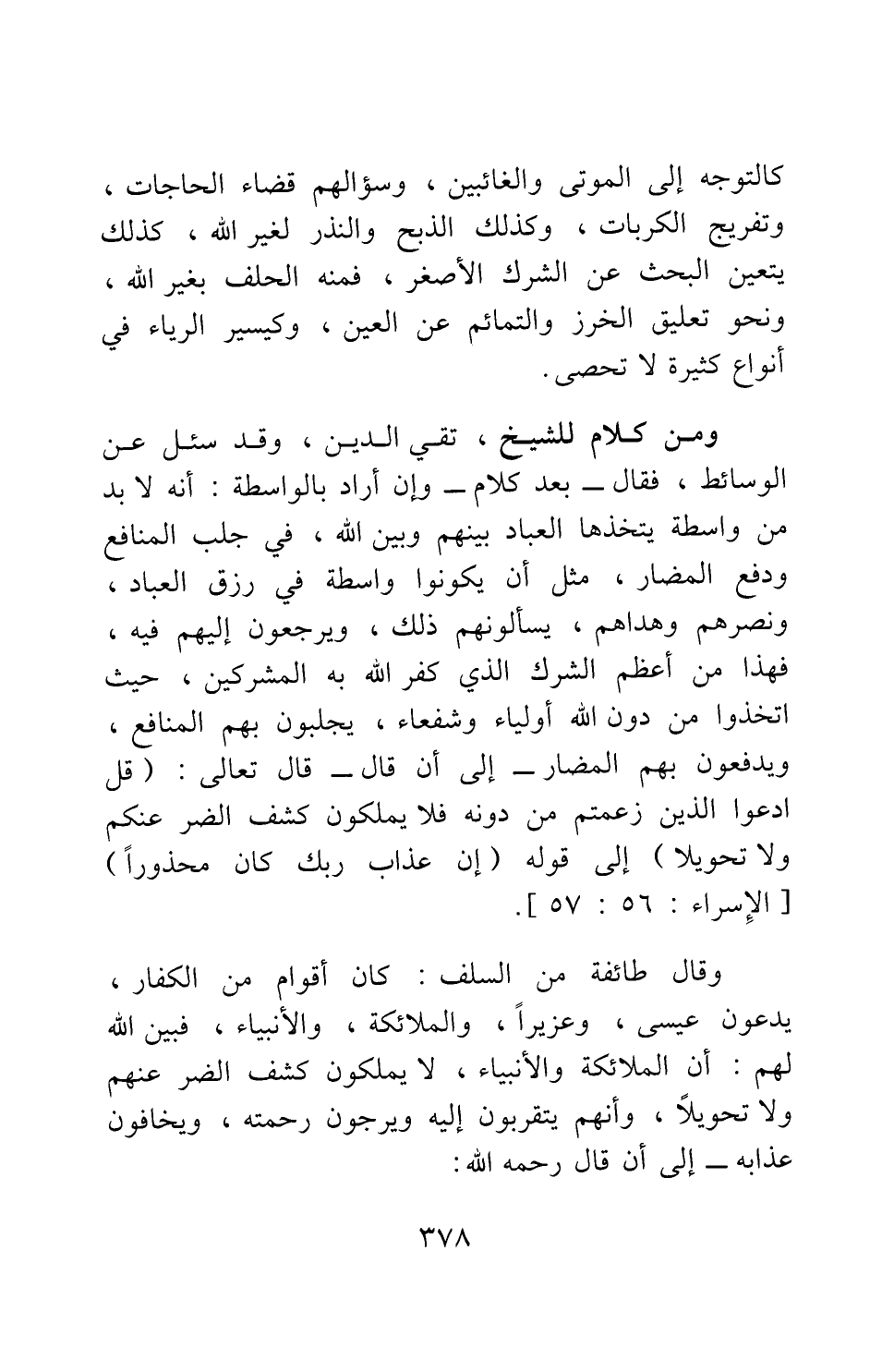 ومن كلام للشيخ تقي الدين، وقد سئل عن الوسائط، فقال - بعد كلام -: وإن أراد بالواسطة: أنه لا بد من واسطة يتخذها العباد بينهم وبين الله، في جلب المنافع ودفع المضار، مثل أن يكونوا واسطة في رزق العباد، ونصرهم وهداهم، يسألونهم ذلك، ويرجعون إليهم فيه، فهذا من أعظم الشرك الذي كفر الله به المشركين، حيث اتخذوا من دون الله أولياء وشفعاء، يجلبون بهم المنافع، ويدفعون بهم المضار، إلى أن قال: قال تعالى: {قُلِ ادْعُوا الَّذِينَ زَعَمْتُمْ مِنْ دُونِهِ فَلا يَمْلِكُونَ كَشْفَ الضُّرِّ عَنْكُمْ وَلا تَحْوِيلاً} 1 إلى قوله {إِنَّ عَذَابَ رَبِّكَ كَانَ مَحْذُوراً} 2.