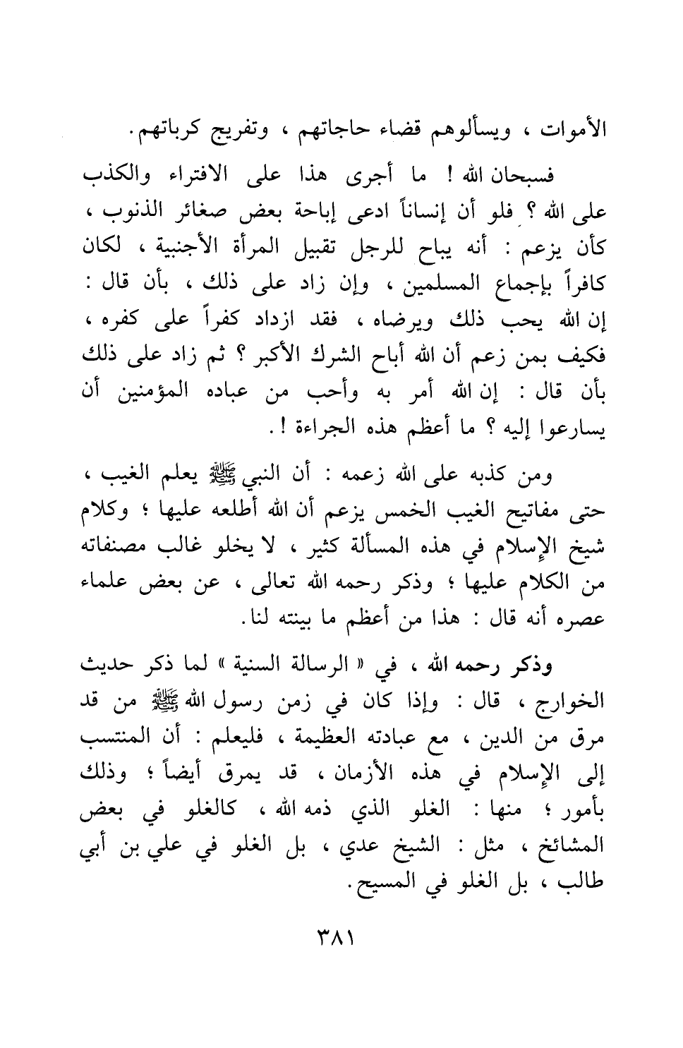 وذكر رحمه الله، في "الرسالة السنية" لما ذكر حديث الخوارج، قال: وإذا كان في زمن رسول الله صلى الله عليه وسلم من قد مرق من الدين، مع عبادته العظيمة، فليعلم أن المنتسب إلى الإسلام في هذه الأزمان، قد يمرق أيضا; وذلك بأمور; منها: الغلو الذي ذمه الله، كالغلو في بعض المشائخ، مثل: الشيخ عدي، بل الغلو في علي بن أبي طالب، بل الغلو في المسيح.
