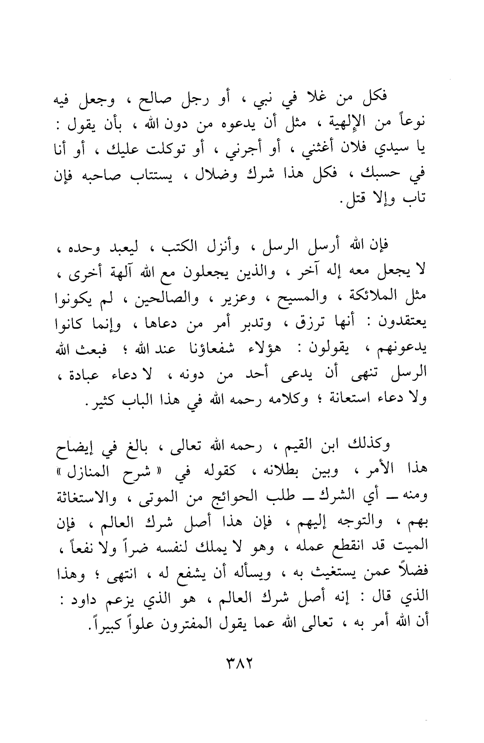 فكل من غلا في نبي، أو رجل صالح، وجعل فيه نوعا من الإلهية، مثل أن يدعوه من دون الله، بأن يقول: يا سيدي فلان أغثني، أو أجرني، أو توكلت عليك، أو أنا في حسبك، فكل هذا شرك وضلال، يستتاب صاحبه فإن تاب وإلا قتل.