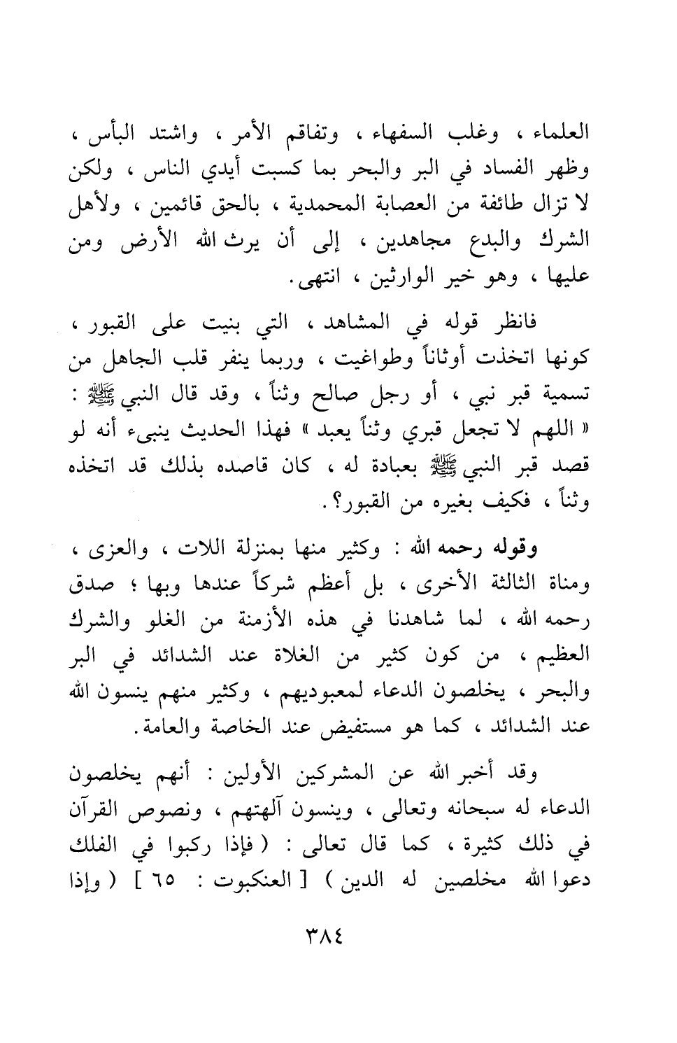 وقوله رحمه الله: وكثير منها بمنْزلة اللات، والعزى، ومناة الثالثة الأخرى، بل أعظم شركا عندها وبها; صدق رحمه الله، لما شاهدنا في هذه الأزمنة من الغلو والشرك العظيم، من كون كثير من الغلاة عند الشدائد في البر والبحر، يخلصون الدعاء لمعبوديهم، وكثير منهم ينسون الله عند الشدائد، كما هو مستفيض عند الخاصة والعامة.