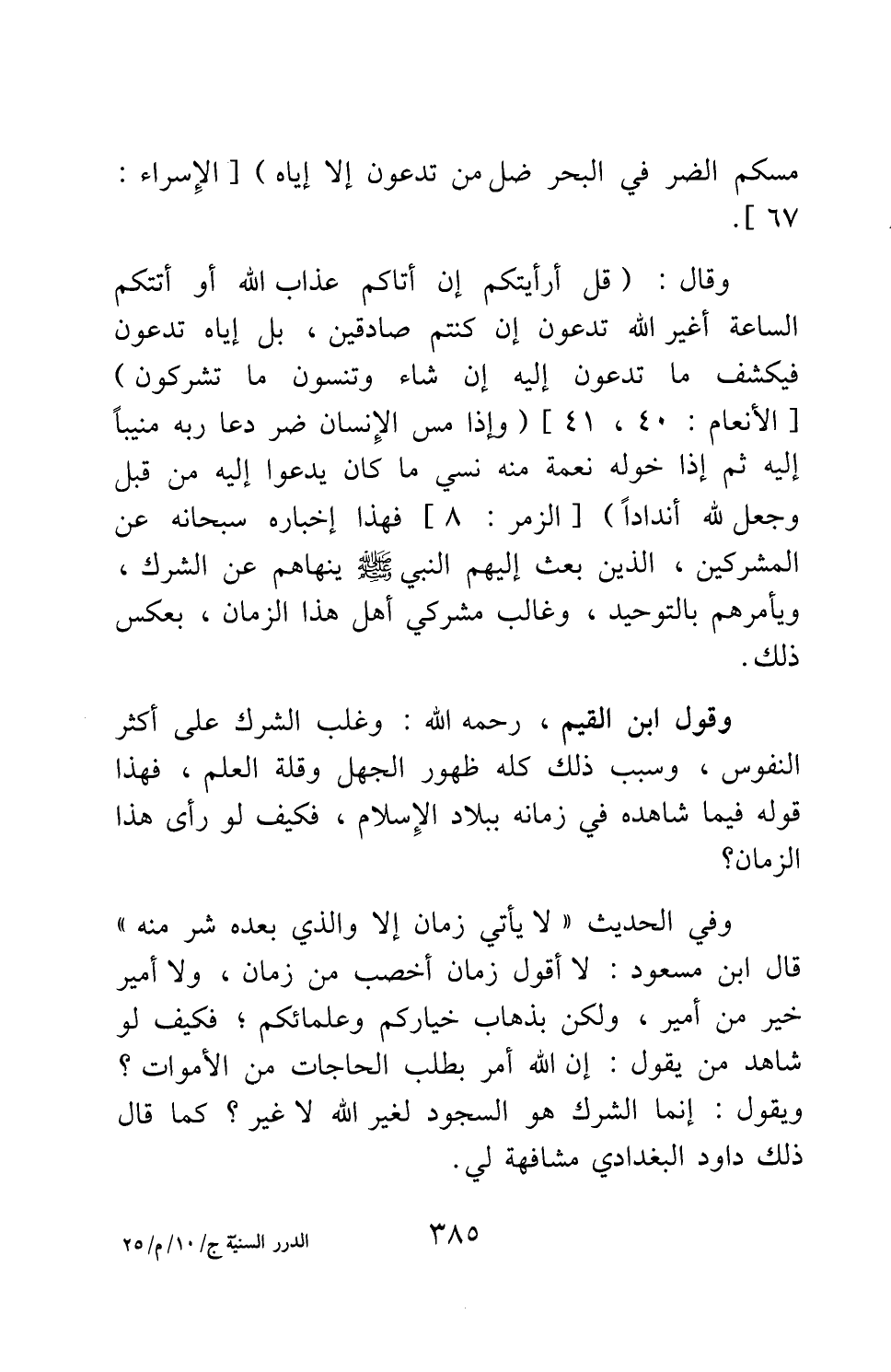 وقول ابن القيم، رحمه الله: وغلب الشرك على أكثر النفوس، وسبب ذلك كله ظهور الجهل وقله العلم، فهذا قوله فيما شاهده في زمانه ببلاد الإسلام، فكيف لو رأى هذا الزمان؟ وفي الحديث: " لا يأتي زمان إلا والذي بعده شر منه " 4؛ قال ابن مسعود: "لا أقول: زمان أخصب من زمان، ولا أمير خير من أمير، ولكن بذهاب خياركم وعلمائكم"، فكيف لو شاهد من يقول: إن الله أمر بطلب الحاجات من الأموات؟ ويقول: إنما الشرك هو السجود لغير الله لا غير؟ كما قال ذلك داود البغدادي مشافهة لي.