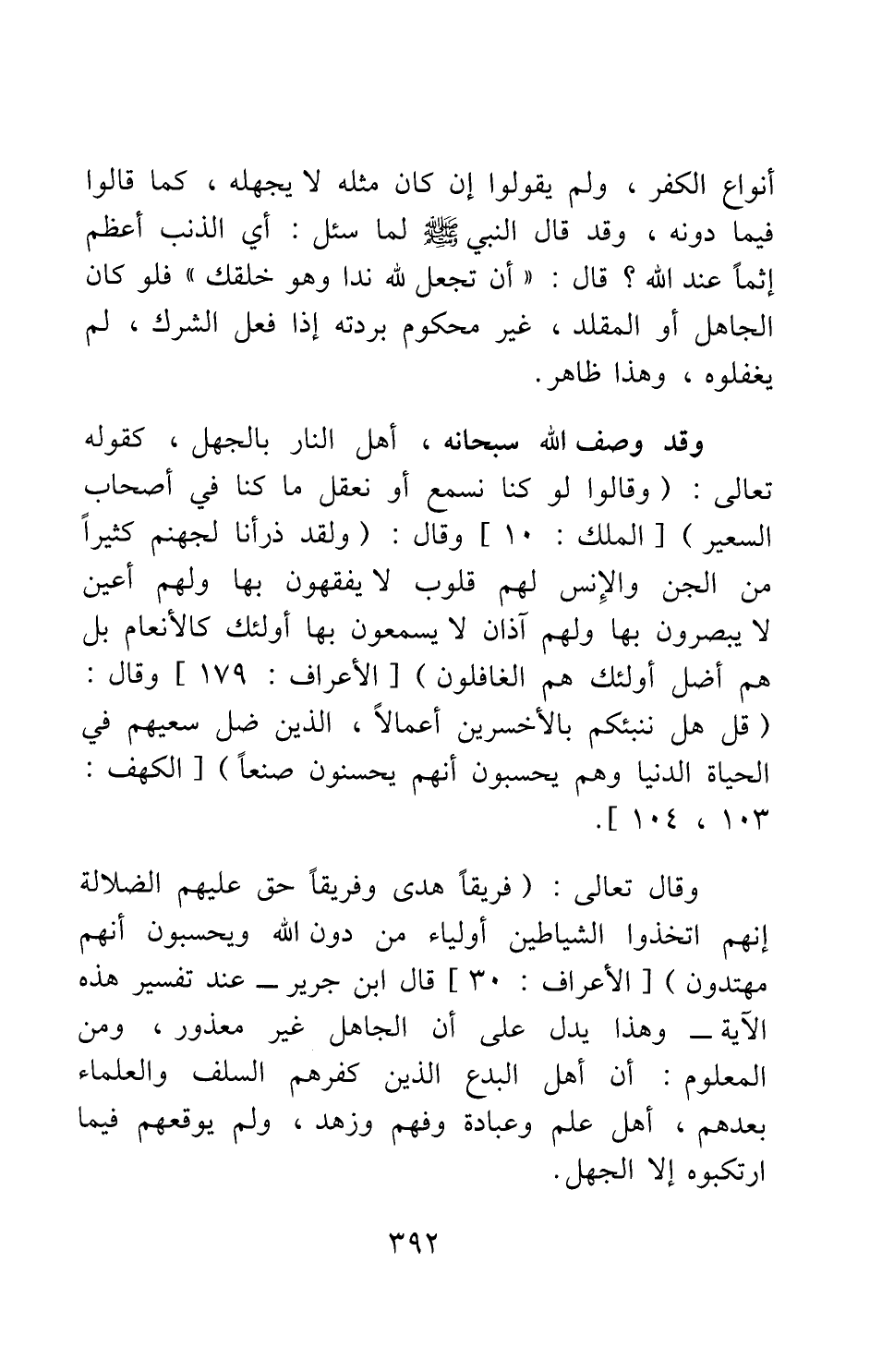 وقال تعالى: {فَرِيقاً هَدَى وَفَرِيقاً حَقَّ عَلَيْهِمُ الضَّلالَةُ إِنَّهُمُ اتَّخَذُوا الشَّيَاطِينَ أَوْلِيَاءَ مِنْ دُونِ اللَّهِ وَيَحْسَبُونَ أَنَّهُمْ مُهْتَدُونَ} 5، قال ابن جرير - عند تفسير هذه الآية -: وهذا يدل على أن الجاهل غير معذور؛ ومن المعلوم: أن أهل البدع الذين كفرهم السلف والعلماء بعدهم، أهل علم وعبادة وفهم وزهد، ولم يوقعهم فيما ارتكبوه إلا الجهل.