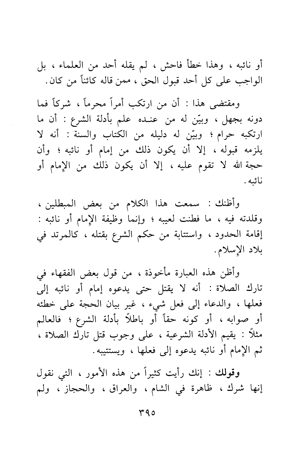 ومقتضى هذا: أن من ارتكب أمرا محرما، شركا فما دونه بجهل، وبين له من عنده علم بأدلة الشرع أن ما ارتكبه حرام، وبين له دليله من الكتاب والسنة، أنه لا يلزمه قبوله، إلا أن يكون ذلك من إمام أو نائبه، وأن حجة الله لا تقوم عليه، إلا أن يكون ذلك من الإمام أو نائبه.